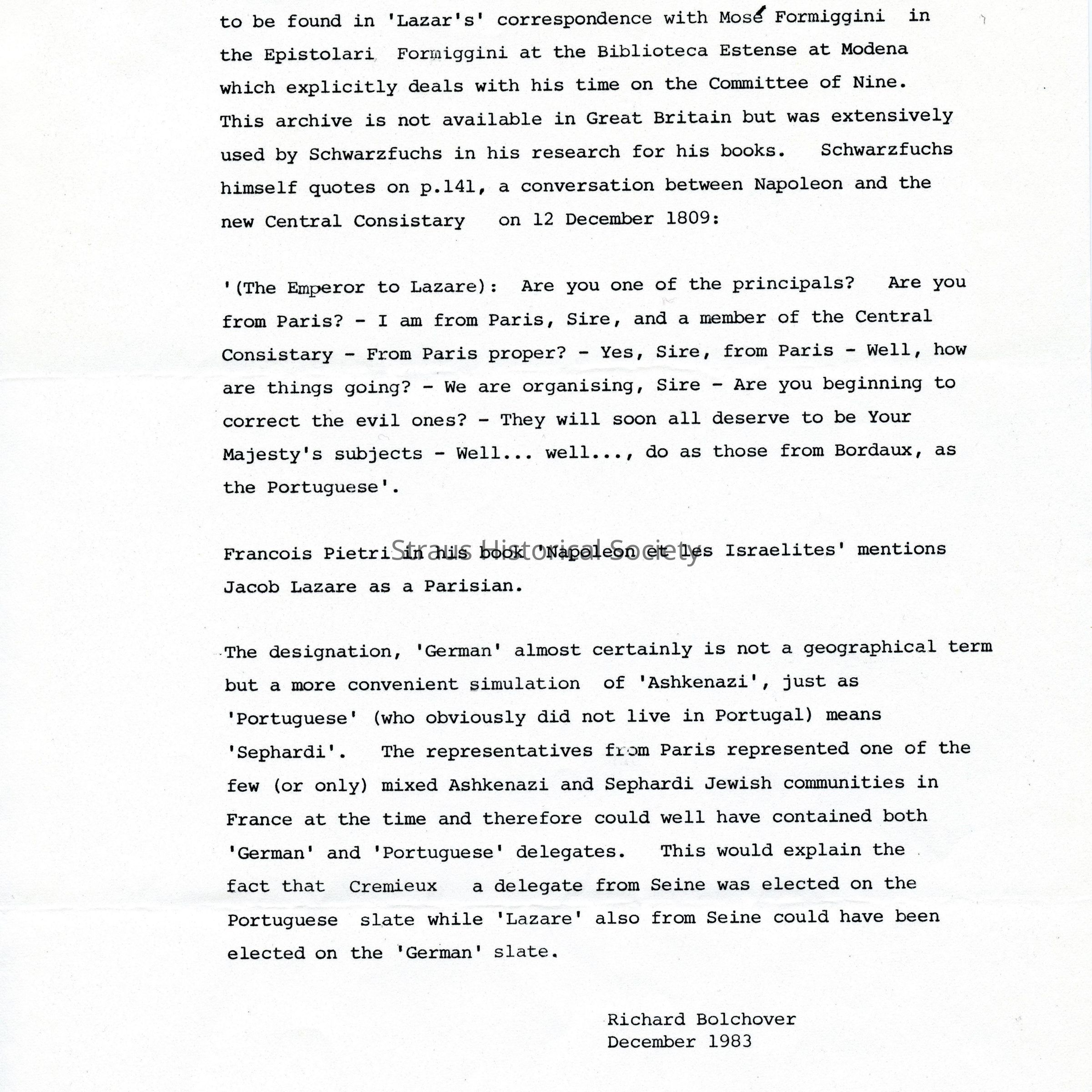 Research Materials: Bolchover, Richard, "Subject: Napoleon and the Jews." November 1983.Entry/Object ID