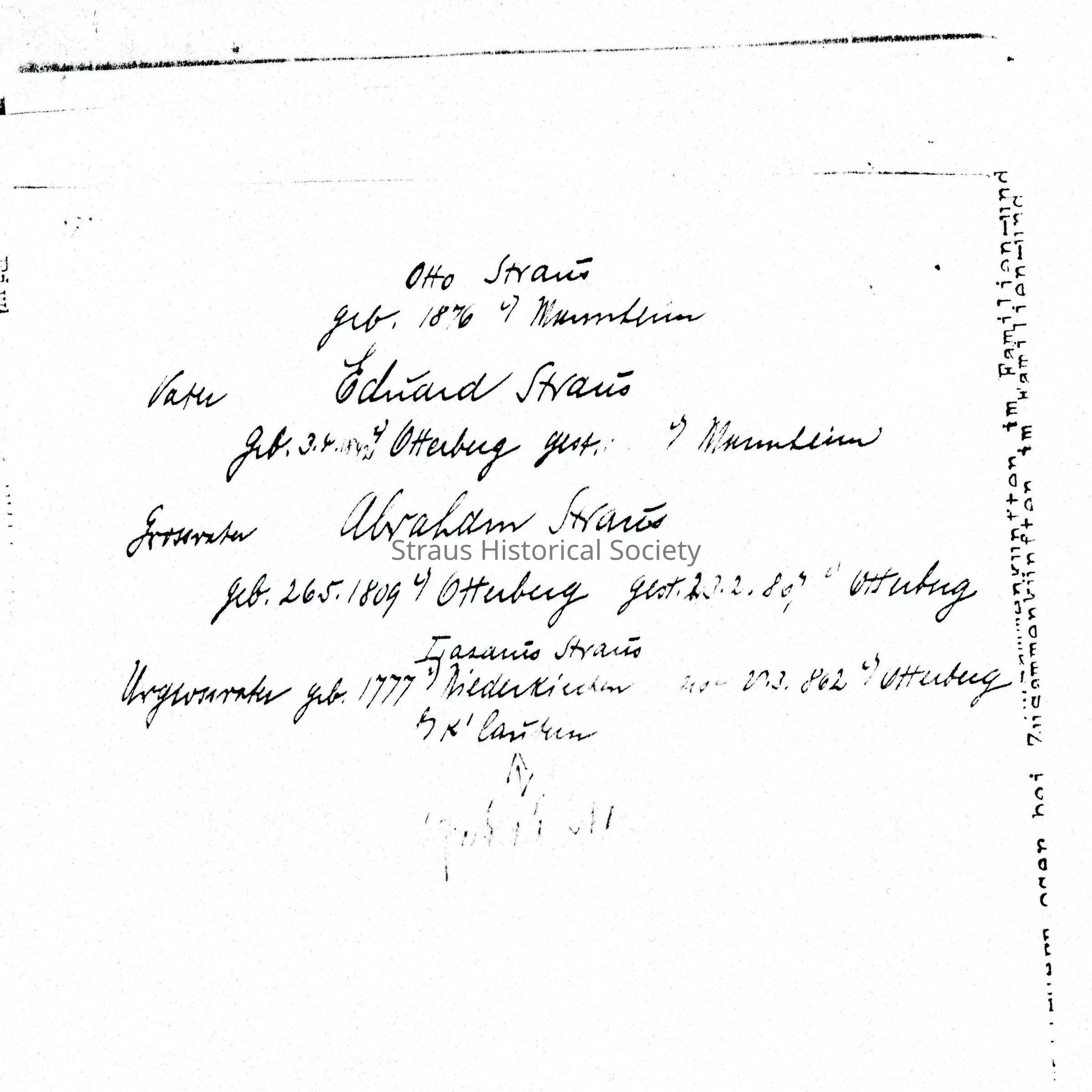 Ancestry of Otto Straus born 1876 in Mannheim. In German. One handwritten page.