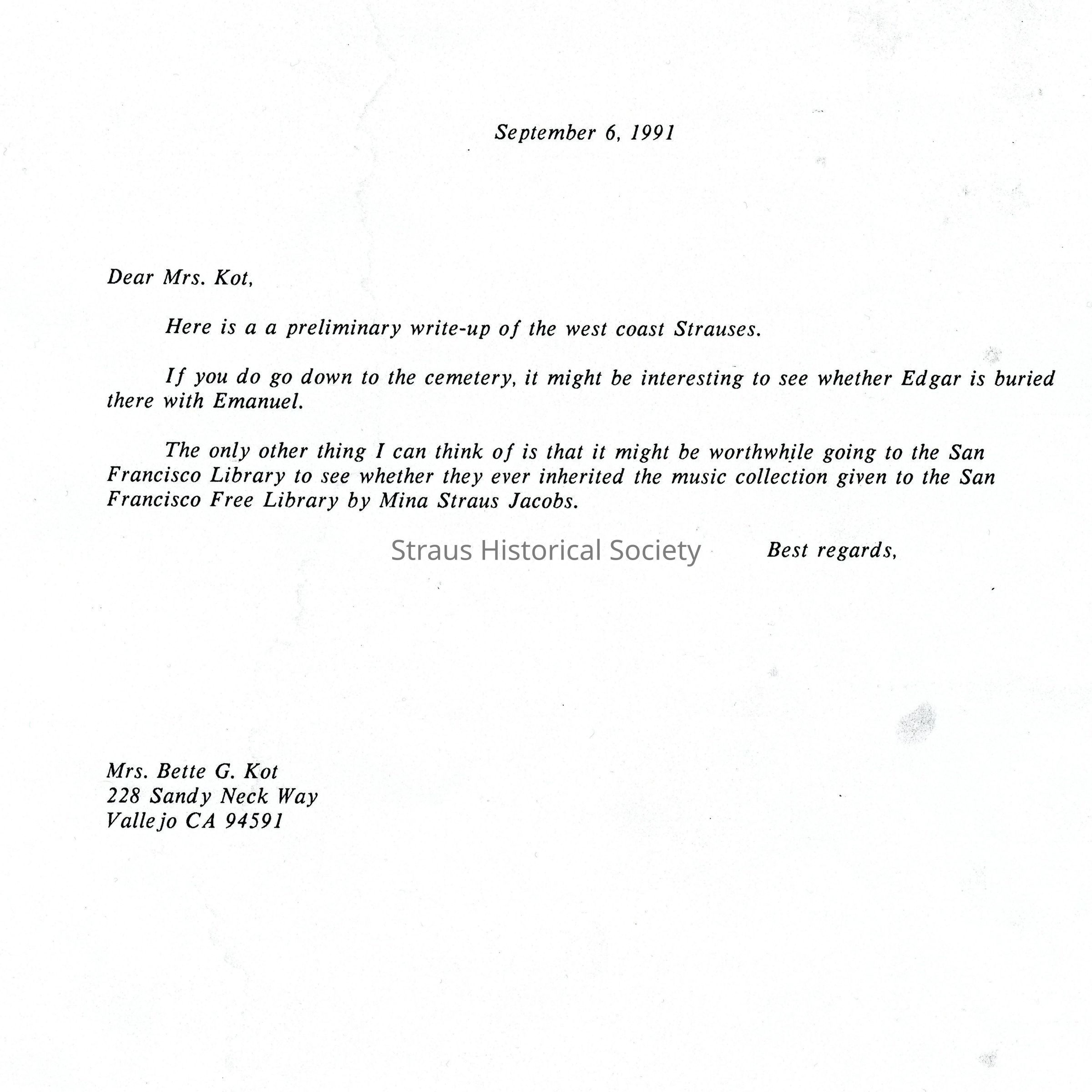 Letter: Straus, Robert K. to Mrs. Kot, (Mrs. Bette Gorrell Kot) 228 Sandy Neck Way, Vallejo, California 94591.6 September 1991.Entry/Object ID