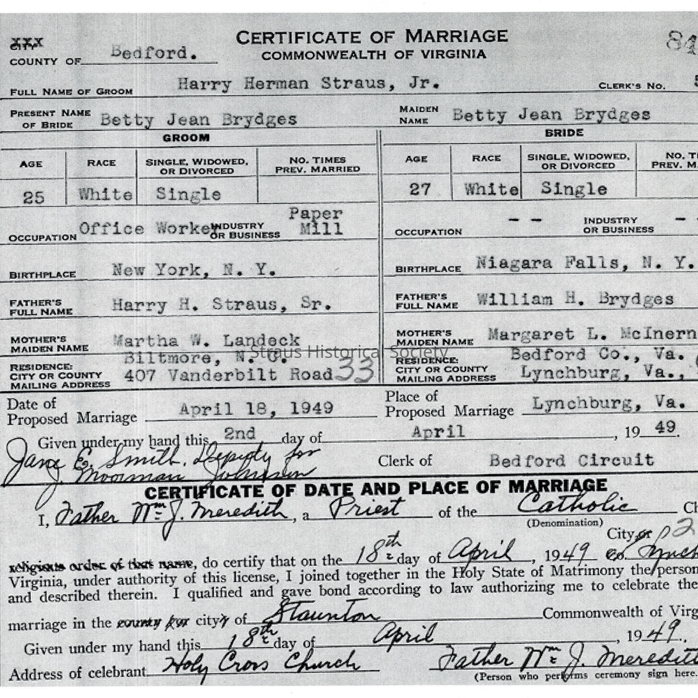 Marriage Certificate: Harry Herman Straus Jr and Betty Jean Brydges, Lynchburg, VA, 18 April 1949.