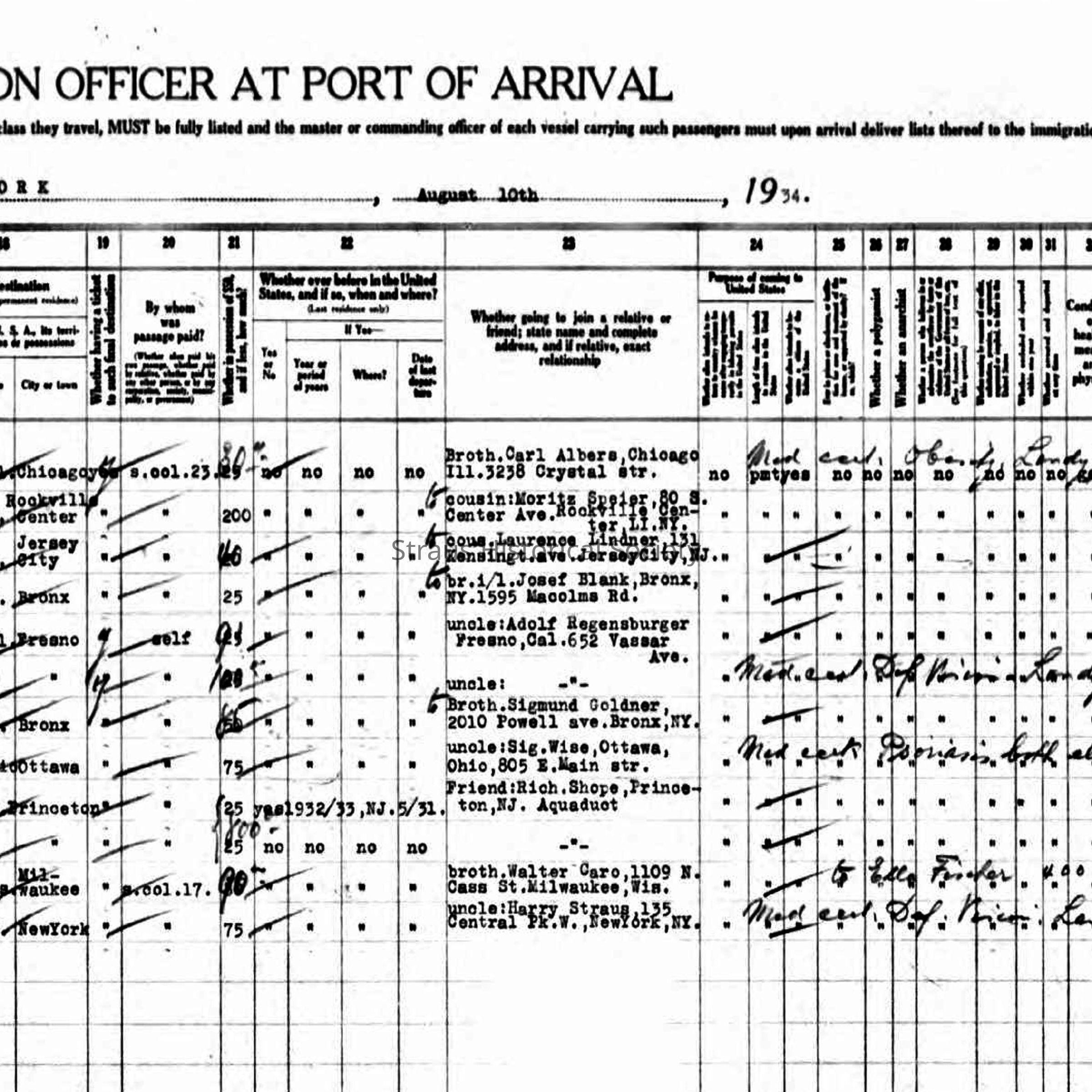 Passenger Manifest: Straus, Walter, age 22, merchant, born Mannheim Germany, Line 12. Sailed on 2 August 1934 on the S.S. Hamburg from Hamburg to New York arriving on 10 August 1934. Two pages.Entry/Object ID