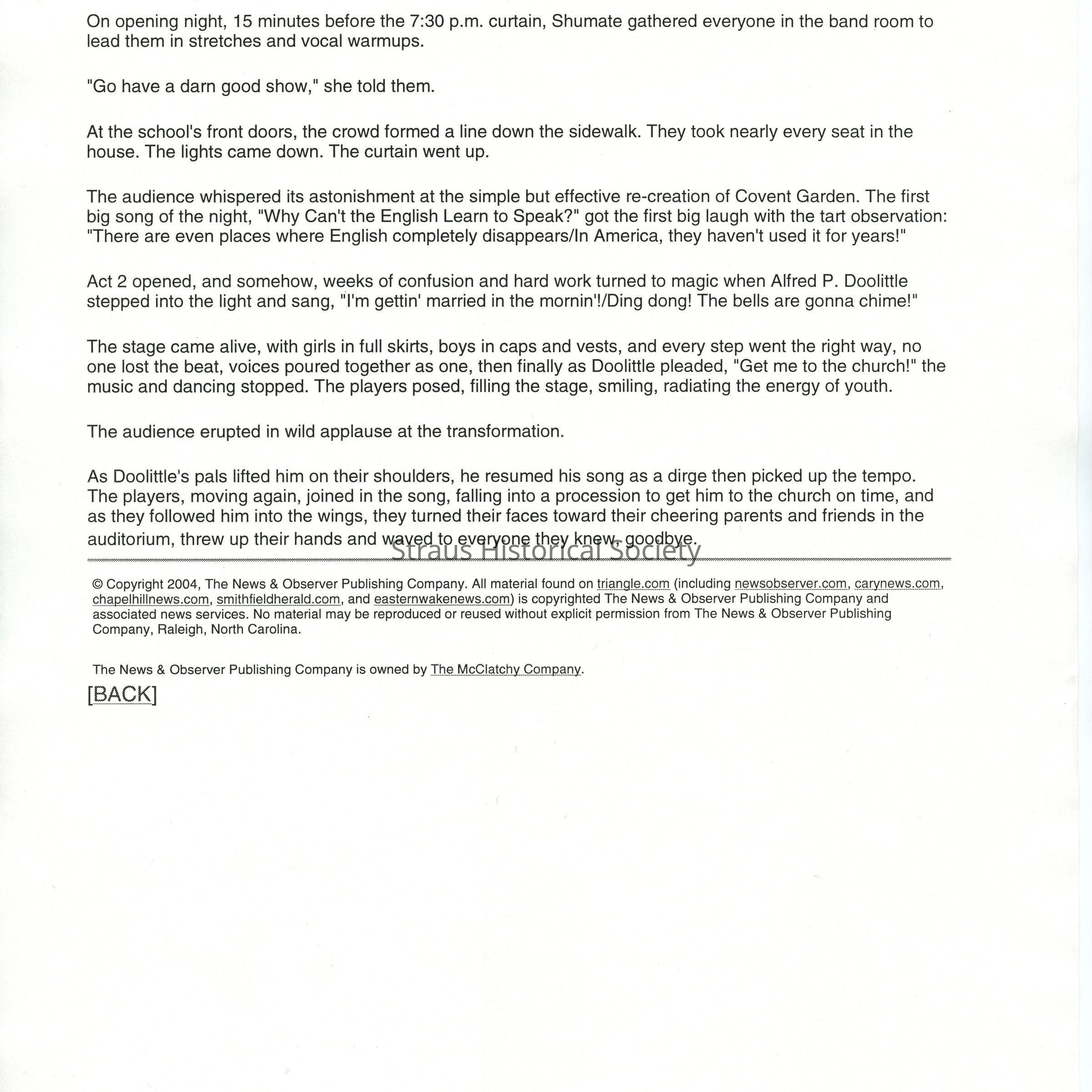 Article: "Mill closes, town reels" Beset by joblessness, Brevard finds joy in rousing high school musical," newsobserver.com 8 June 2003Entry/Object ID