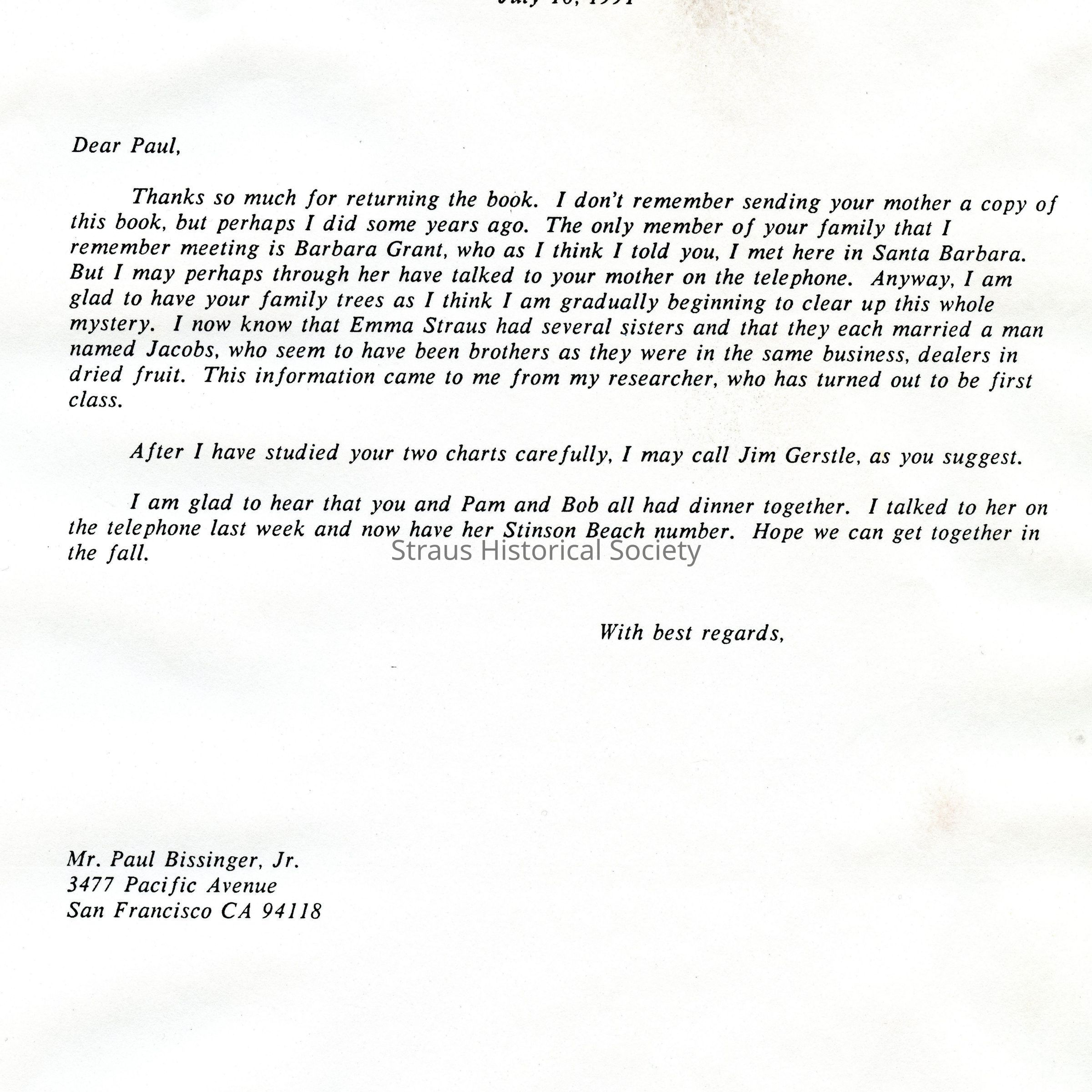 Letter: Straus, Robert K., 1485 East Valley Road, Studio B, P. O. Box 5160, Santa Barbara, CA 93150 to Paul A. Bissinger, Jr., 3477 Pacific Avenue, San Francisco, CA 94118. 10 July 1991. One typewritten page.