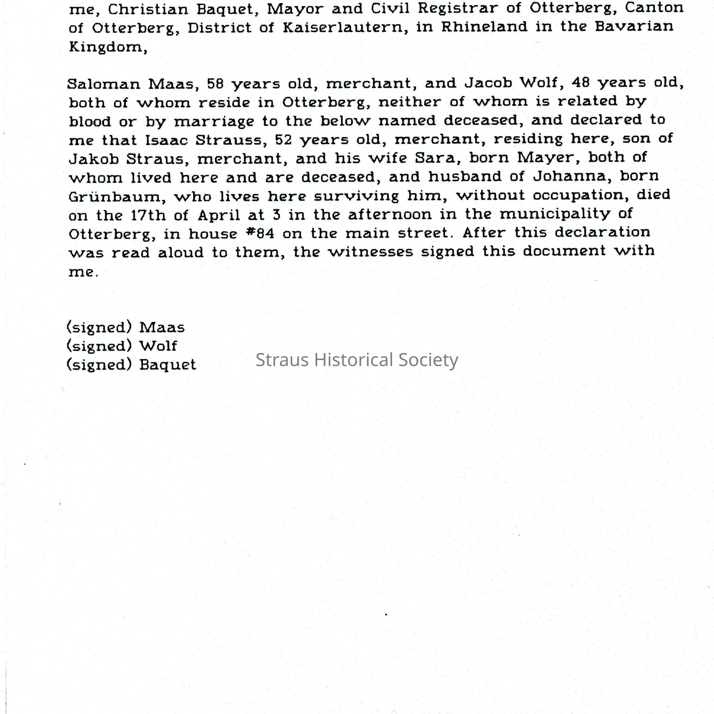 Death Certificate Isac Straus residing in Otterberg died 17 April 1830. In Old German. One printed form with handwritten entries.