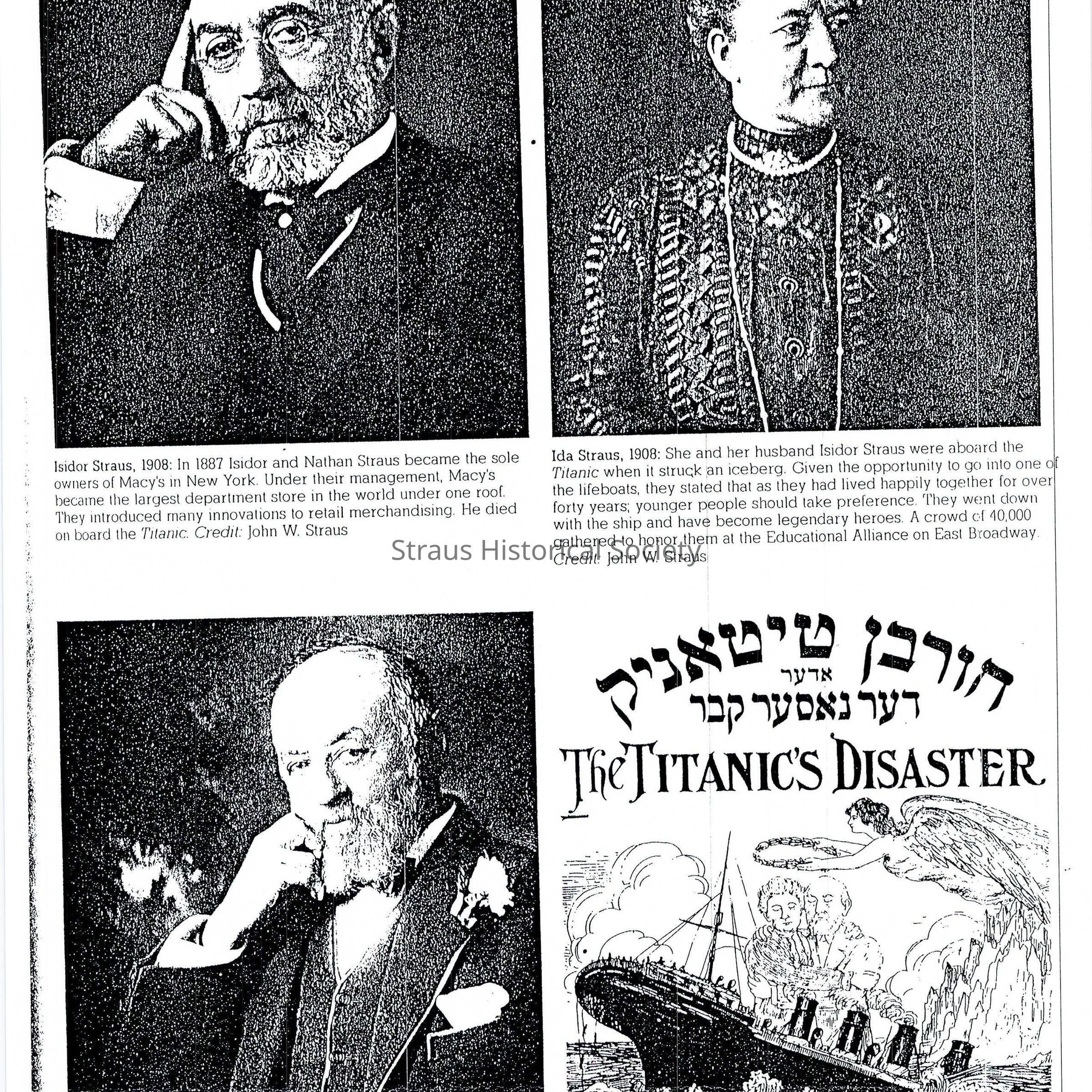 Book: Schoener, Allon. The American Jewish Album, 1654 to the Present. New York: Rizzoli, 1983. Title page, Table of Contents, Foreword, Selected pages of the Index, and pages 61, 67-69, 72-73, 132-133, 160, 175, 213-214, 242, 318-319. Family member mentioned include: Kuhn family, Isidor Straus, Hermine Straus Kohns, Ida Straus, Jacob Straus, Lazarus Straus, Nathan Straus, Oscar S. Straus, Robert Kenneth Straus, Sara Straus, Solomon Straus, Straus Milk Fujnd, R. H. Macy.