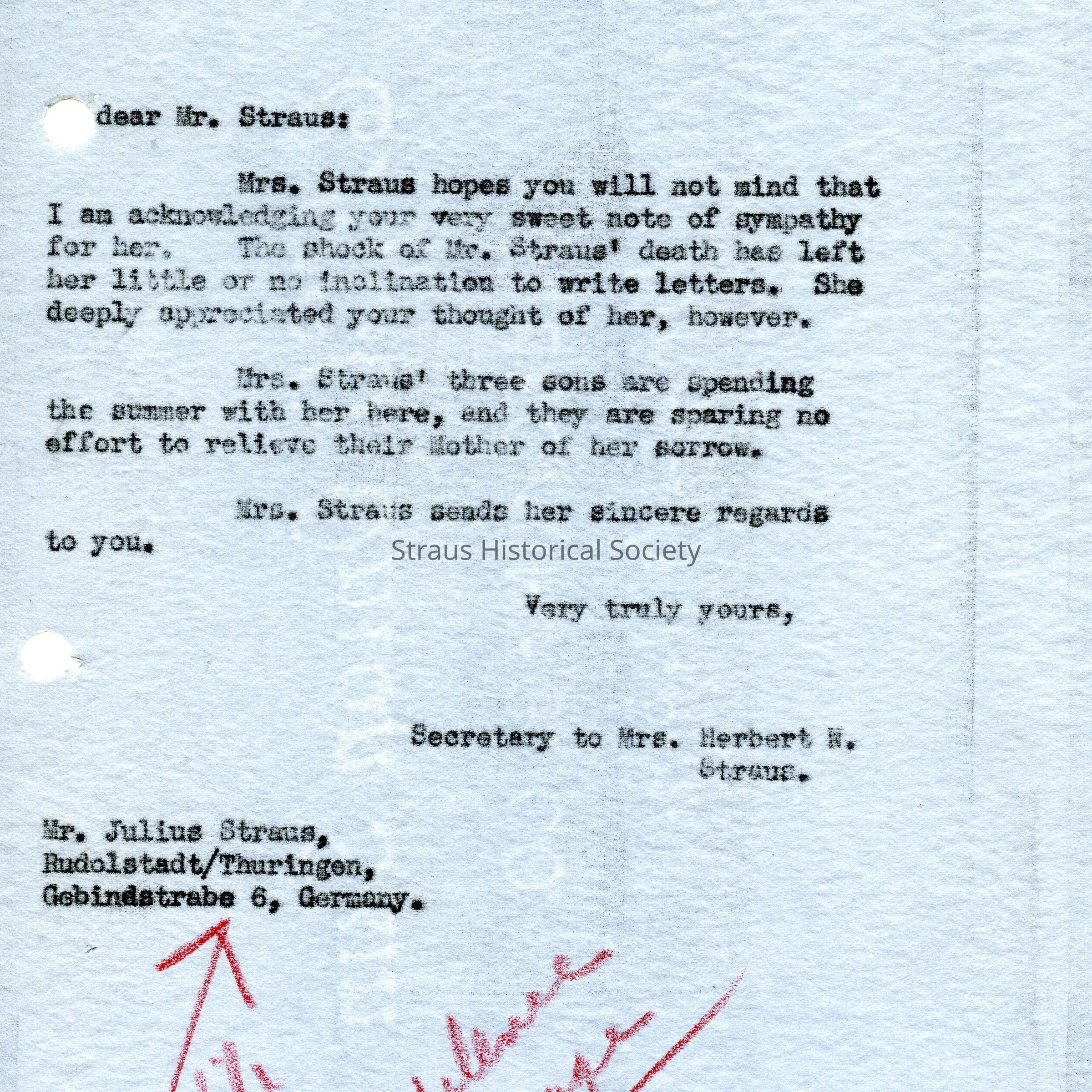 Letter: Secretary to Mrs. Herbert N. Straus, to Julius Straus, Rudolstadt/Thuringen, Gebindstrabe 6, Germany. 13 July 1933.