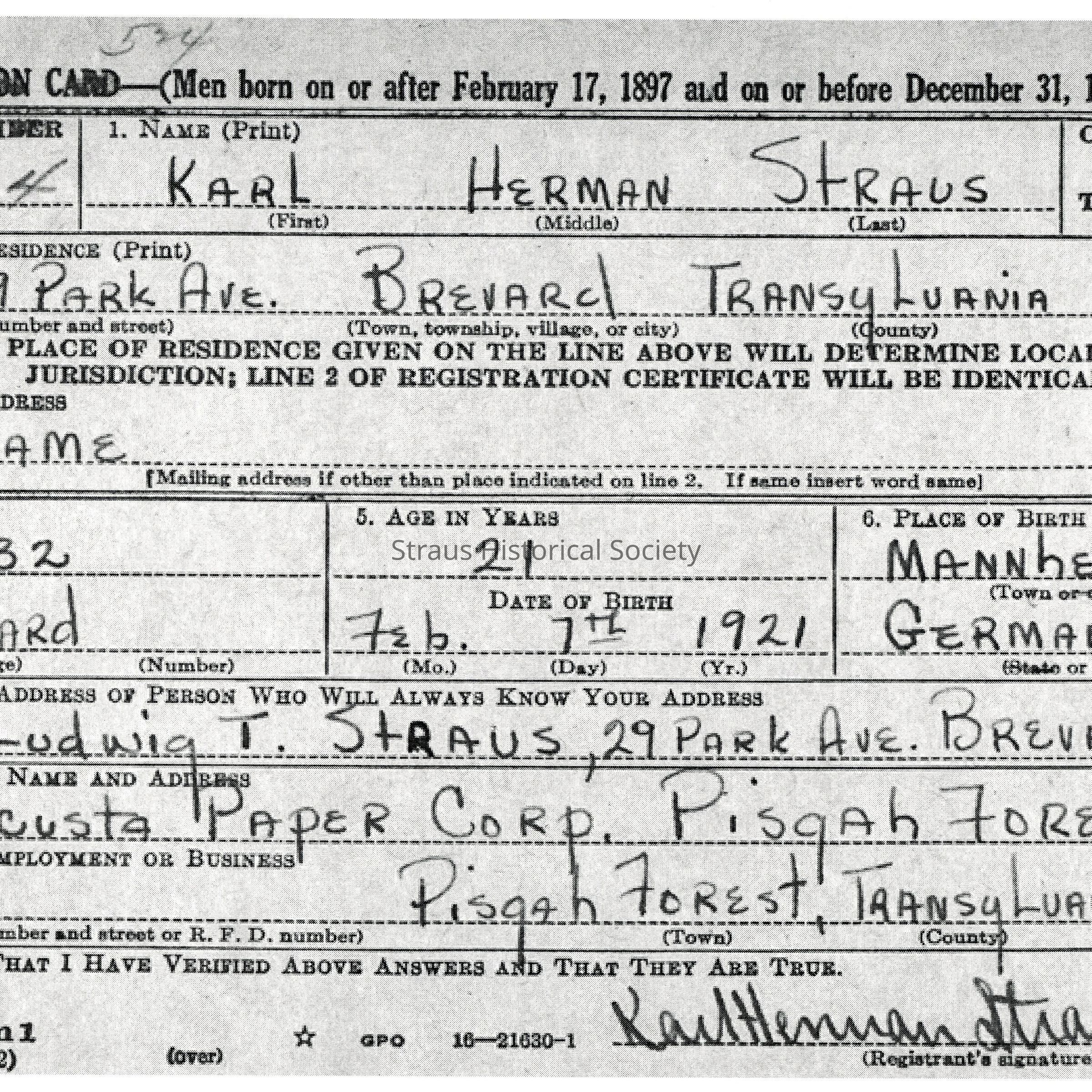World War II Draft Registration: 1942, No. 10,716. Karl Herman Straus. Age 21. Residence Brevard, NC.