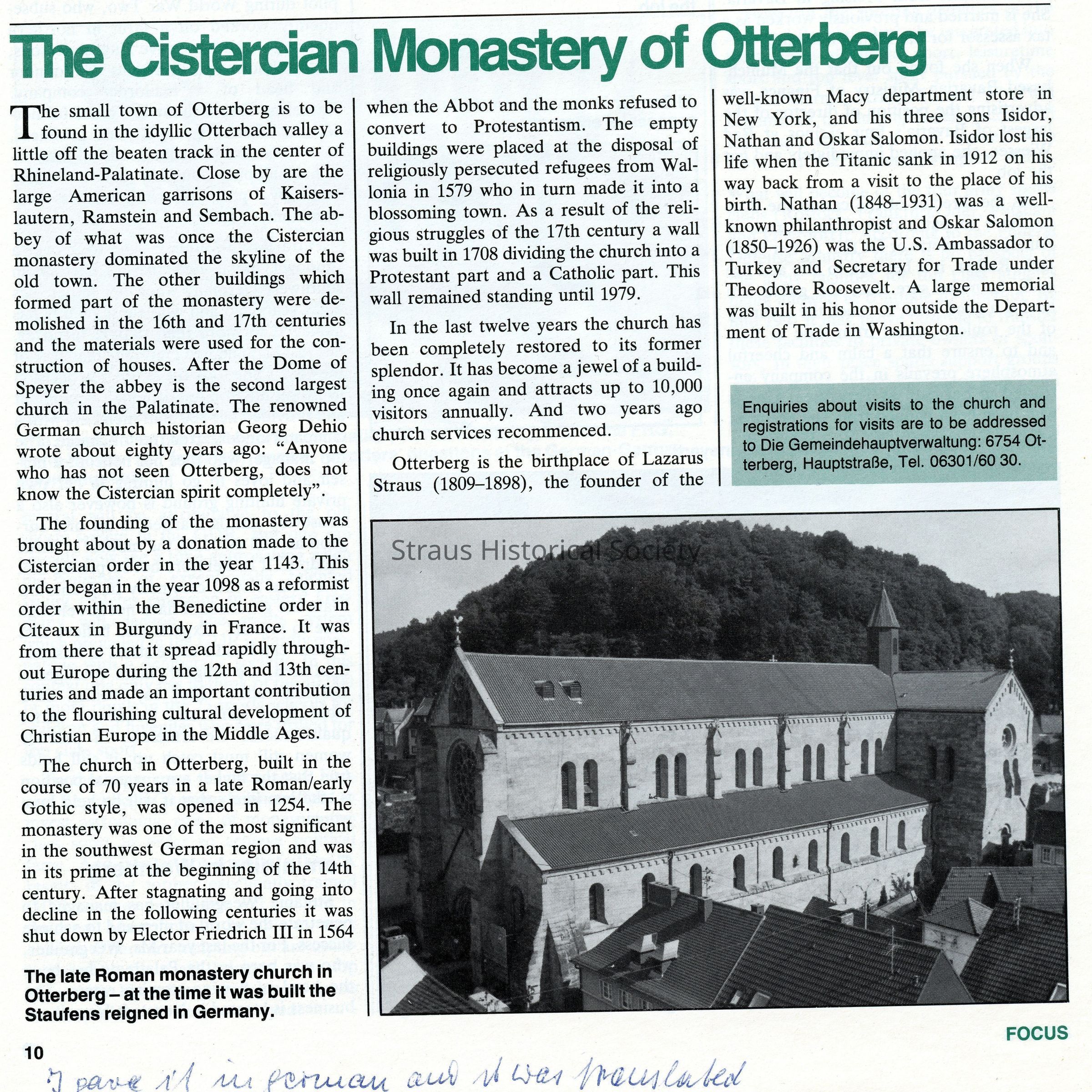 Article titled: "The Cistercian Monastery of Otterberg," from the Paper Focus on Germany.