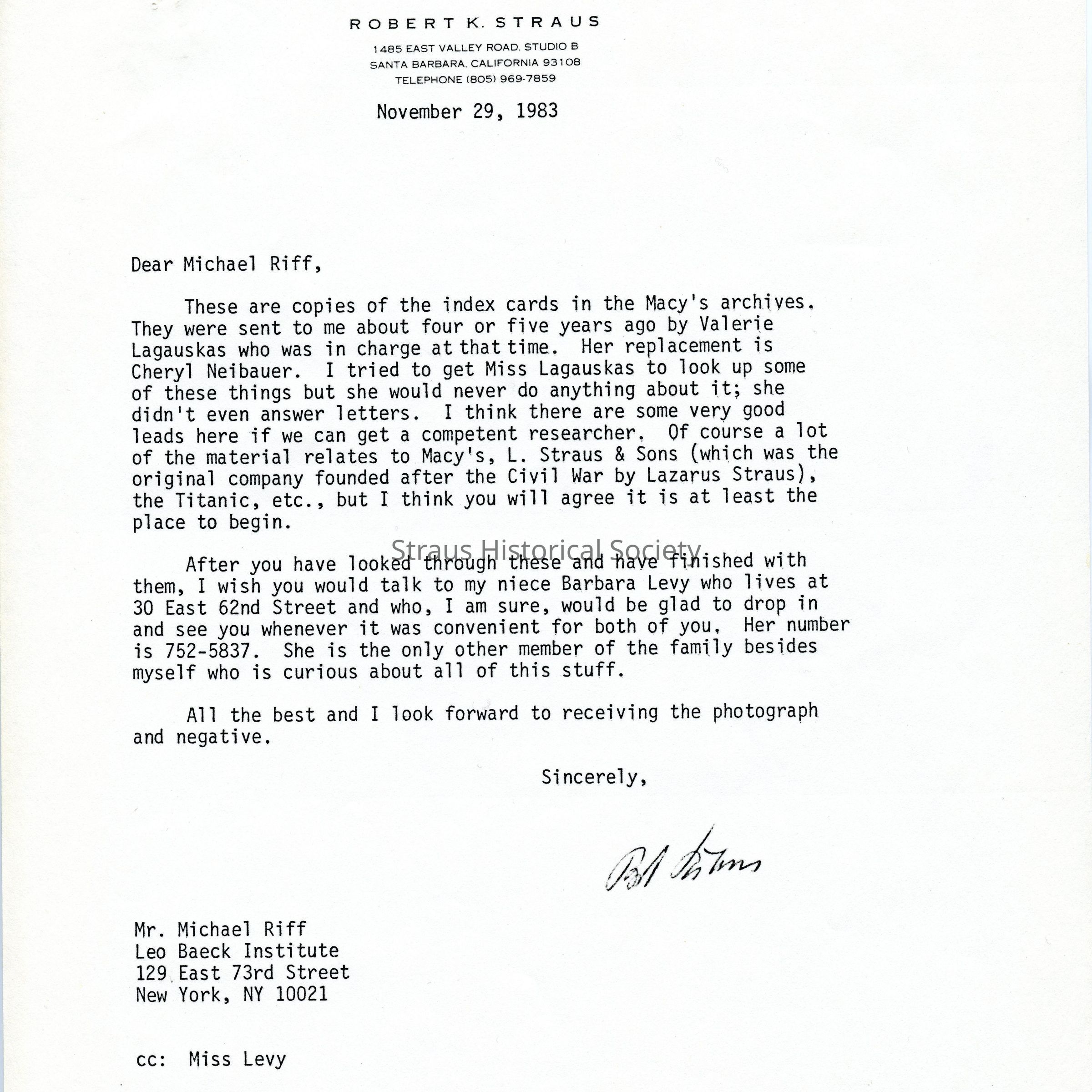 Letter: Straus, Robert Kenneth, Santa Barbara, CA, to Michael Riff, Librarian, Leo Baeck Institute, New York, NY. 29 November 1983.