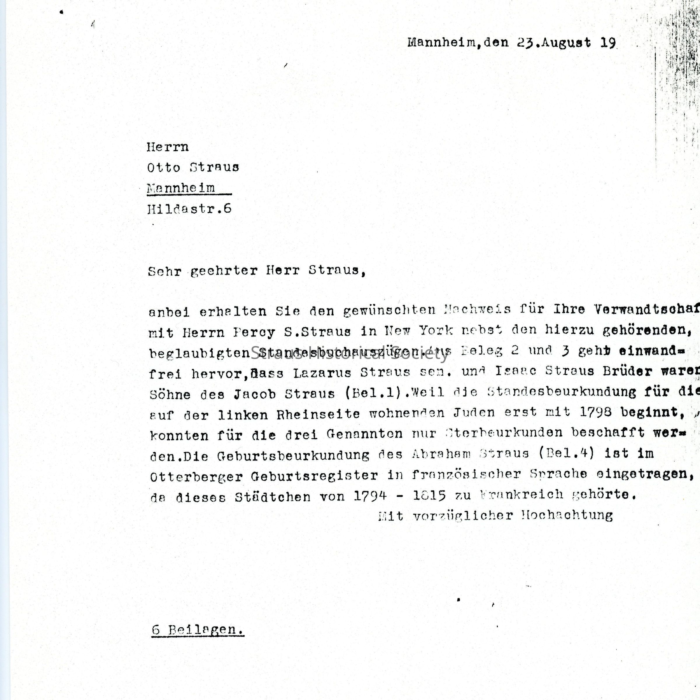 Unsigned, to Herrn Otto Straus, Mannheim, Germany. 23 August 19. In German. One typewritten page.Enclosed in this letter is information about Percy S. Straus in New York as well as information on Issac Straus, Lazarus Straus and Jacob Straus.