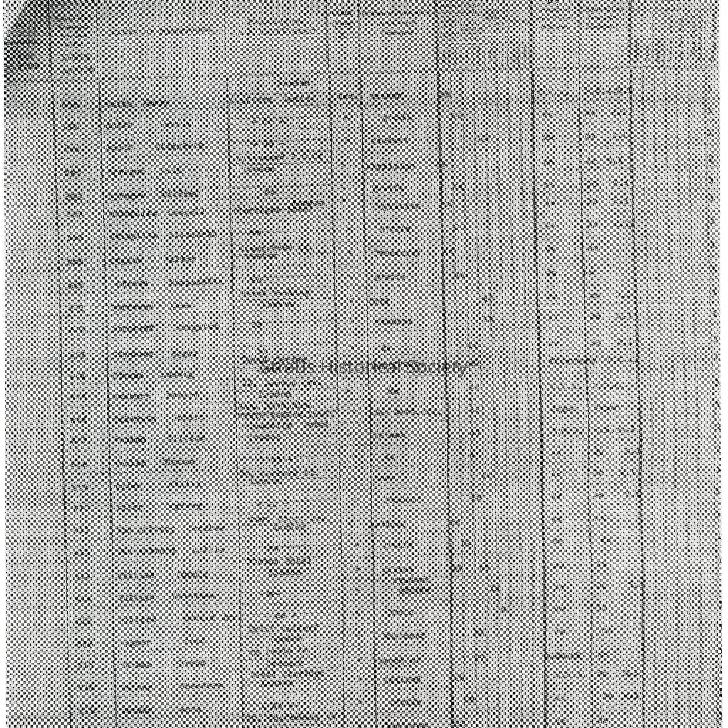 Passenger Manifest: Name and Description of Alien passengers: Cunard Line: ship Aquitania", Port of Arrival Southampton, Date of Arrival 22 June 1926: Record # 604, Ludwig Straus, 1st Class, Address in UK Hotel Goring, London, Manufacturer, Age 45, Citizen of Germany, Last Residence: USA.