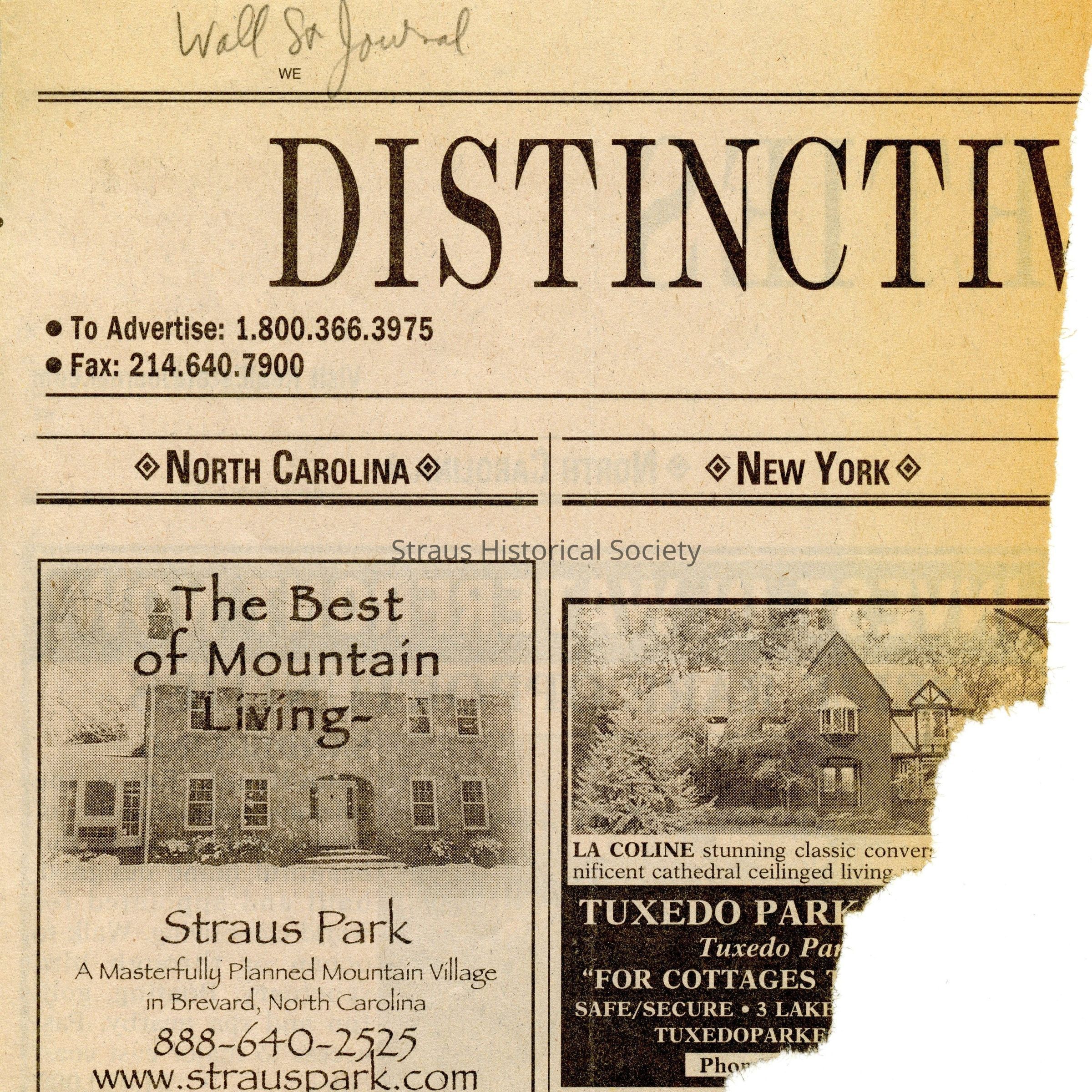 Advertisement: "The Best Mountain Living, - Straus Park: A Masterfully Planned Mountain Village, Brevard, NC." Wall Street Journal. Undated. One column.