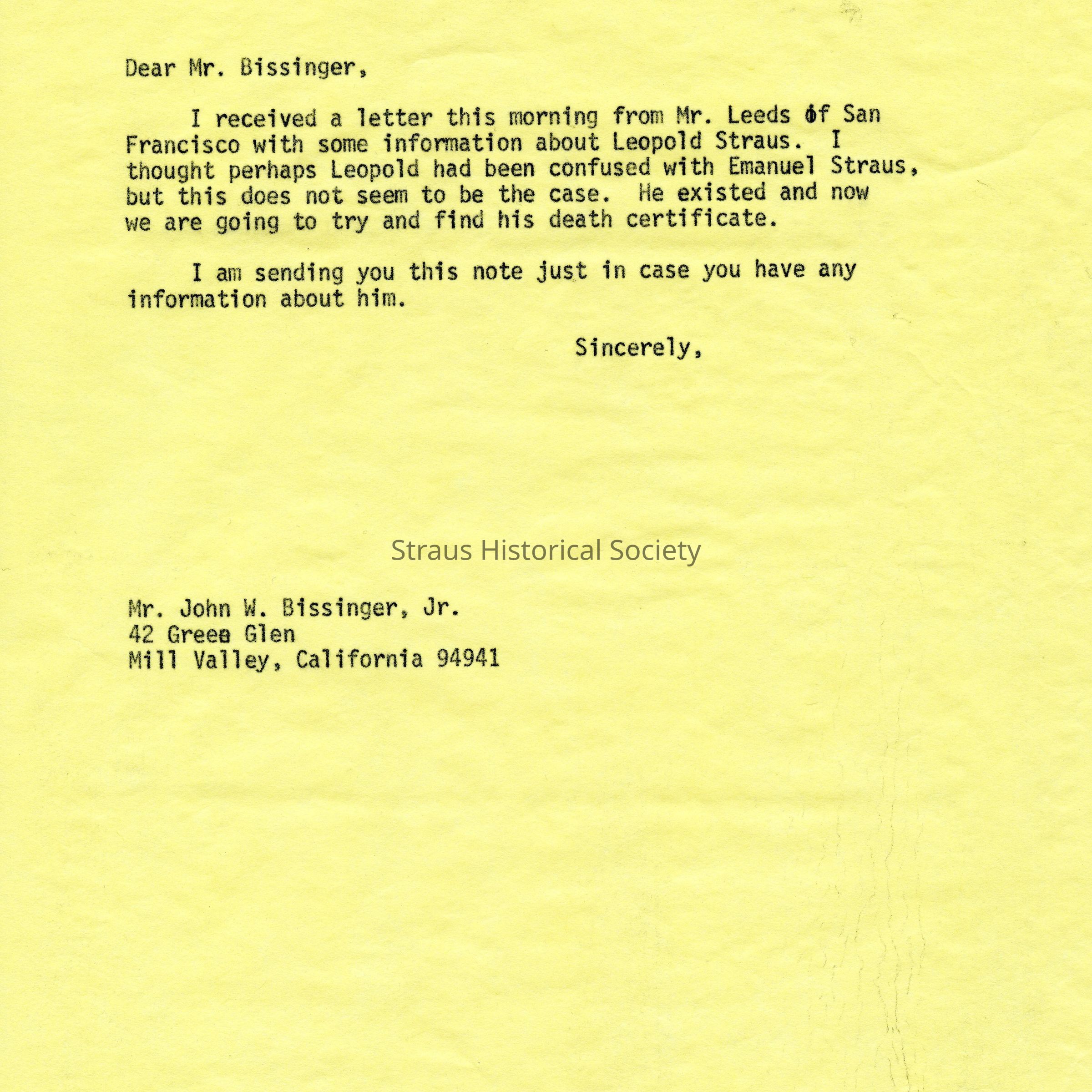 In this letter Bissinger informs Straus that he will try and locate the death certificate of Leopold Straus.