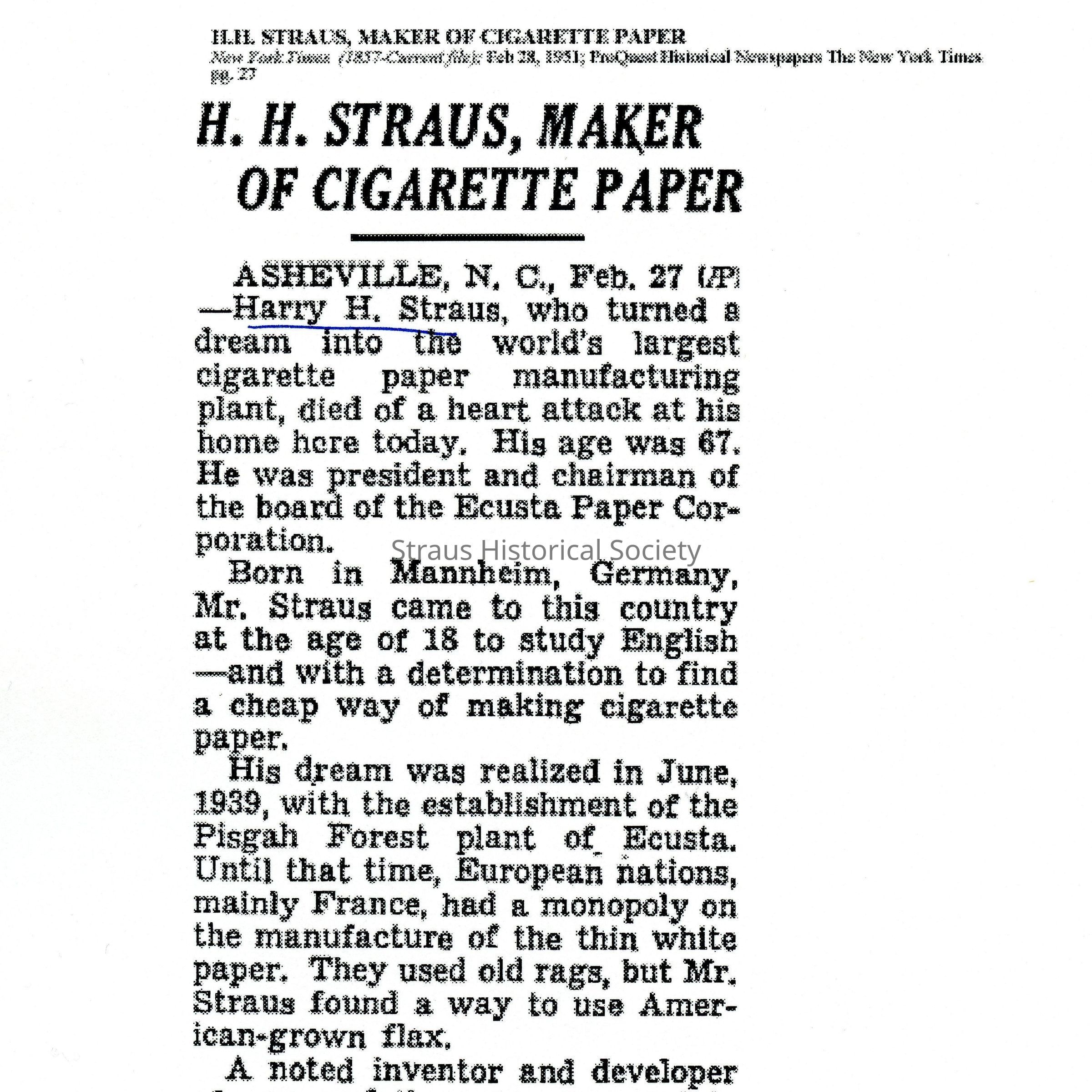 Article: "H. H. Straus, Maker of Cigarette Papers," The New York Times. 28 February 1951.