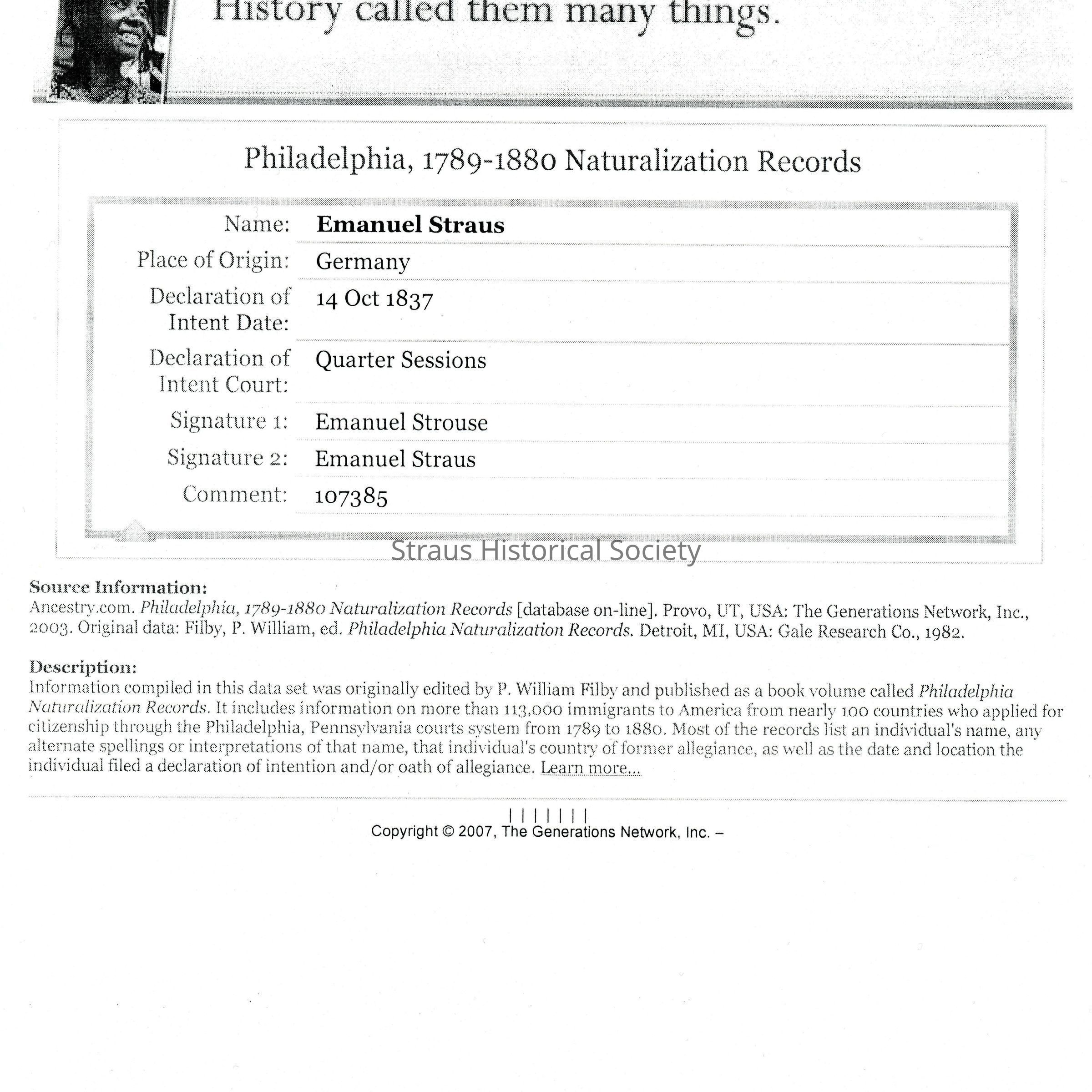 Philadelphia, 1789-1880 Naturalization Records: Emanuel Straus, Place of Origin: Germany. Declaration of Intent: 14 October 1837. Declaration of Intent Court: Quarter Sessions. Comment: 107385.