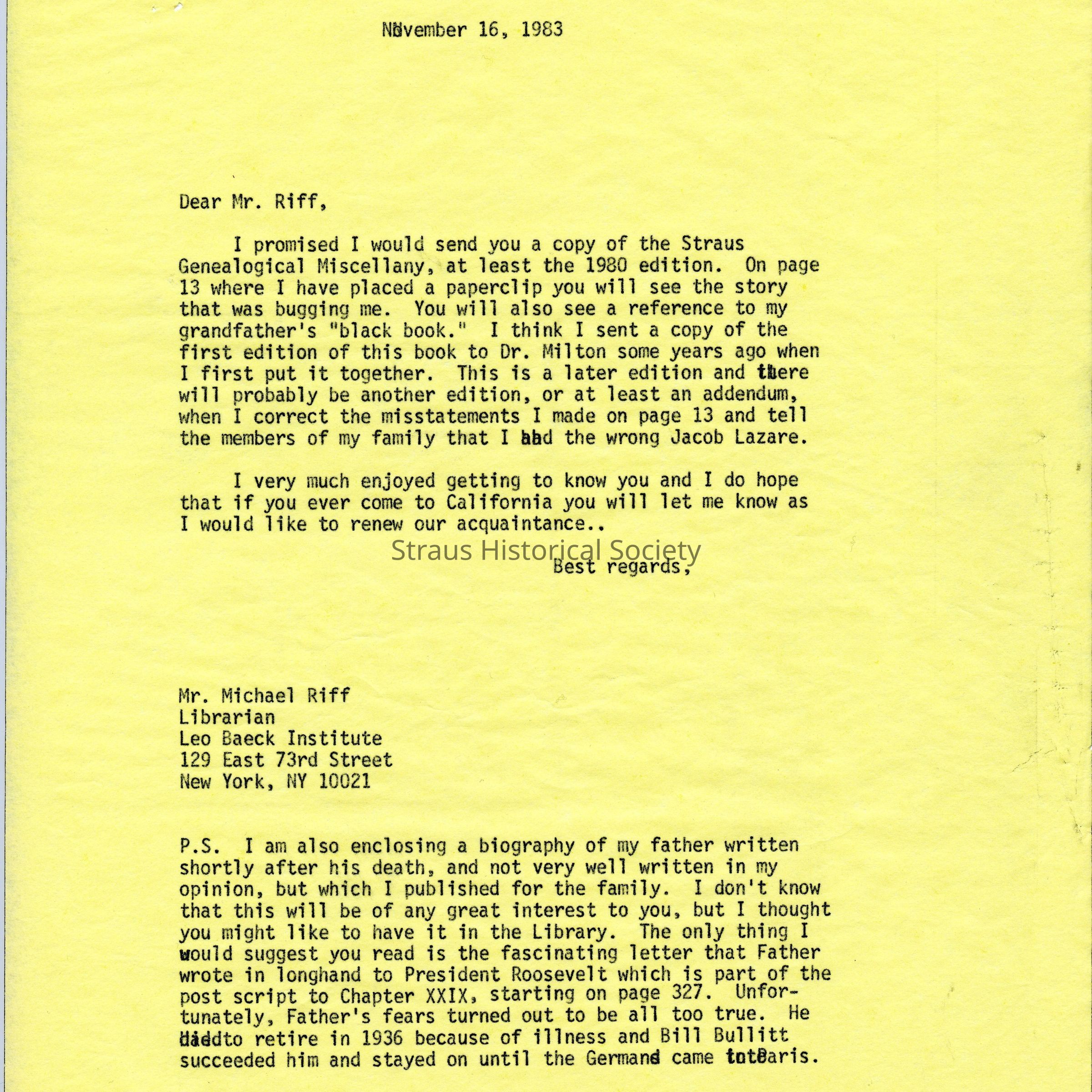 In this letter R. Straus encloses a copy of his work Straus Family Geneological Miscellany, and gives thanks to Michael Riff, the Librarian for all of his help in Straus's search for information about his ancestors.