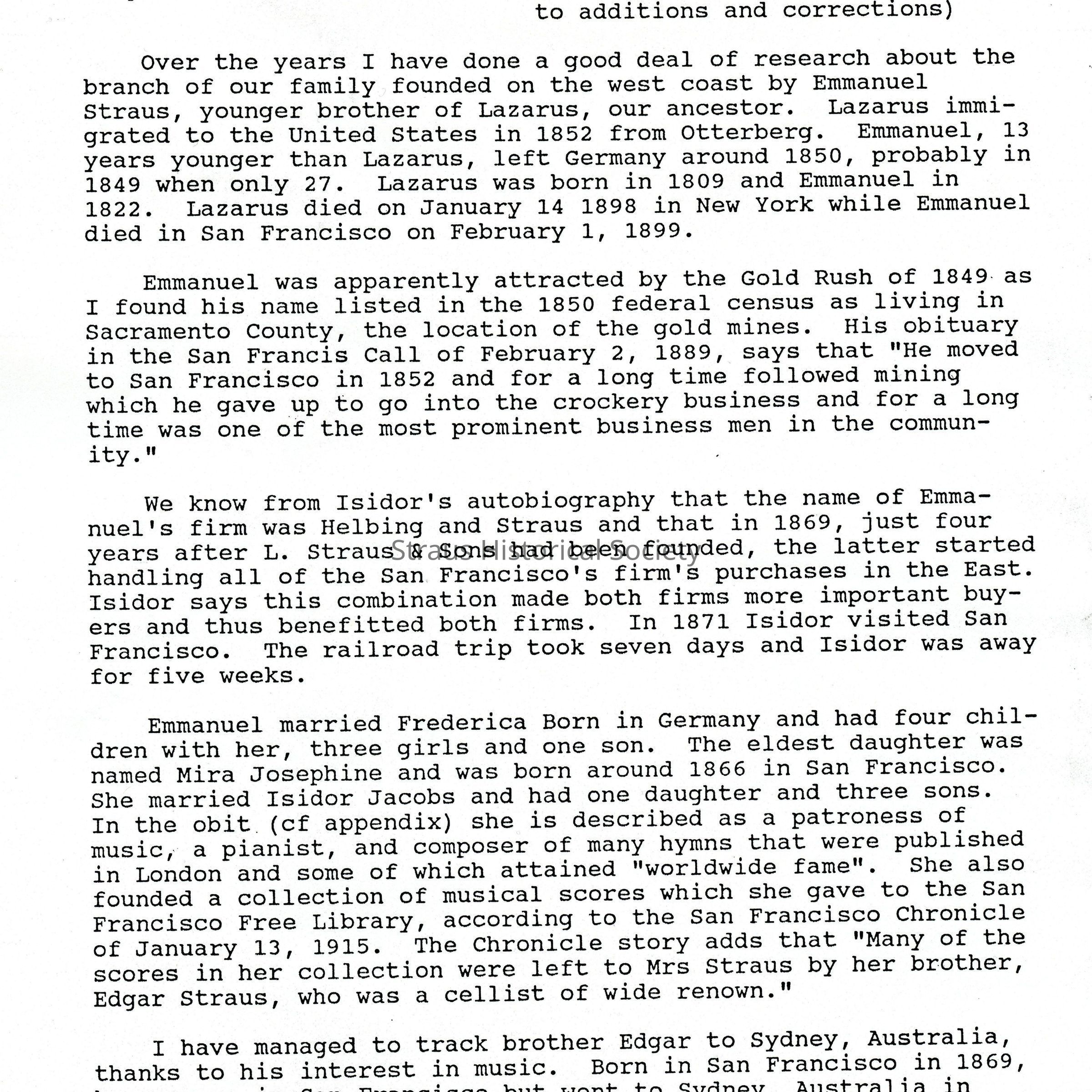 Letter is regarding the biographical and genealogical information about Emanuel Straus and his family, that Robert K. Straus and Trissa Waddingham found in their research.