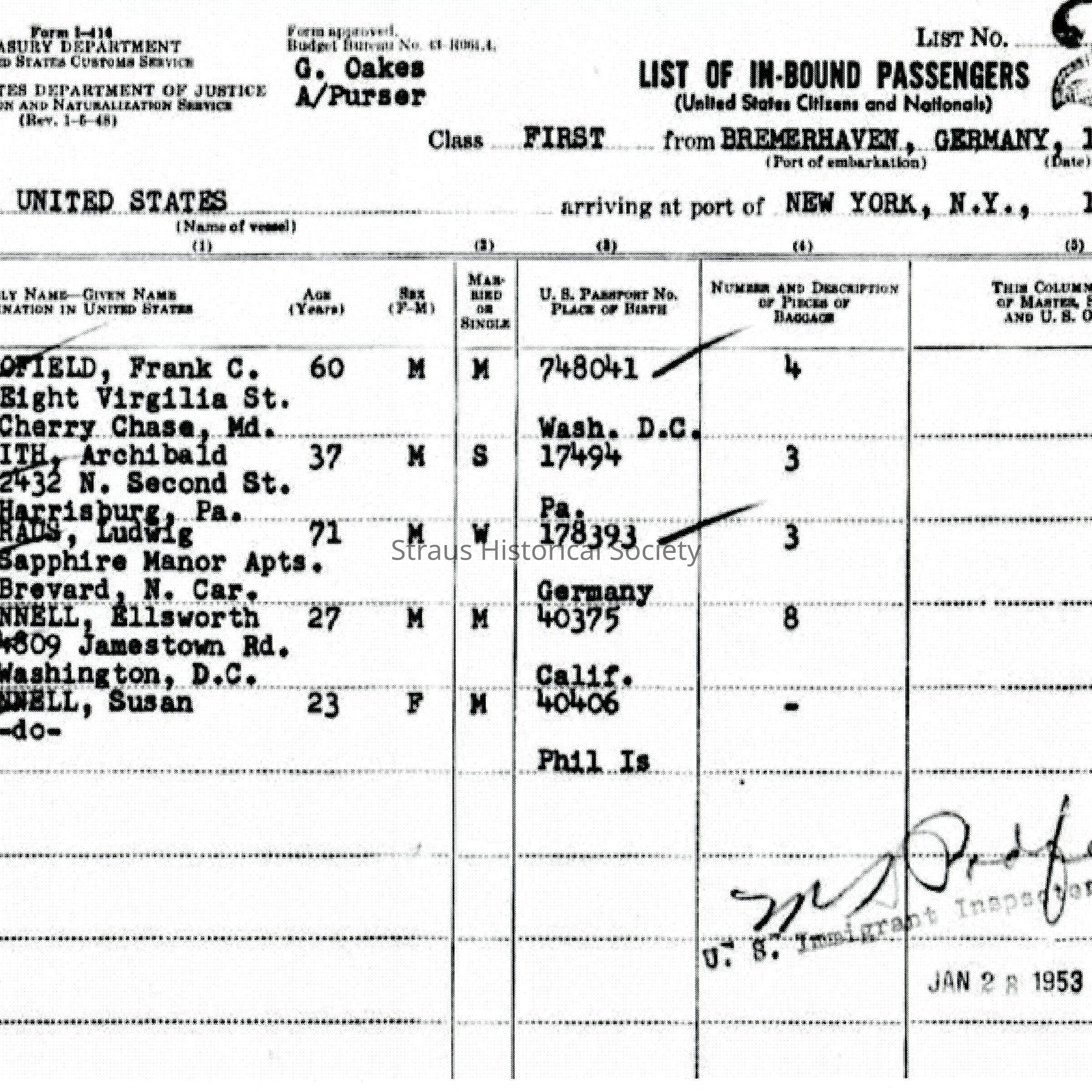 Passenger Manifest: SS United States list of inbound passengers from Bremerhaven Germany sailing January 22, 1953, arriving in NY January 28, 1953. Ludwig Straus, age 71, Born Germany, US Passport 178393, three pieces of luggage.