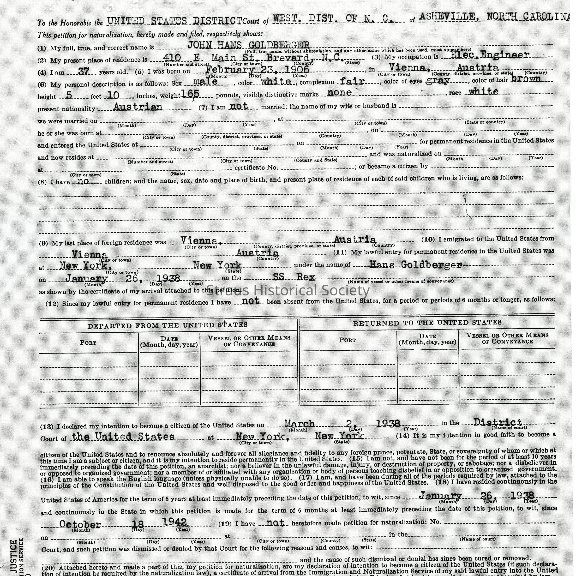 Petition for Naturalization: Certificate # 638, John Hans Goldberger, 410 E. Main St., Brevard, N.C. Elec. Engineer. 18 October 1942. One page.