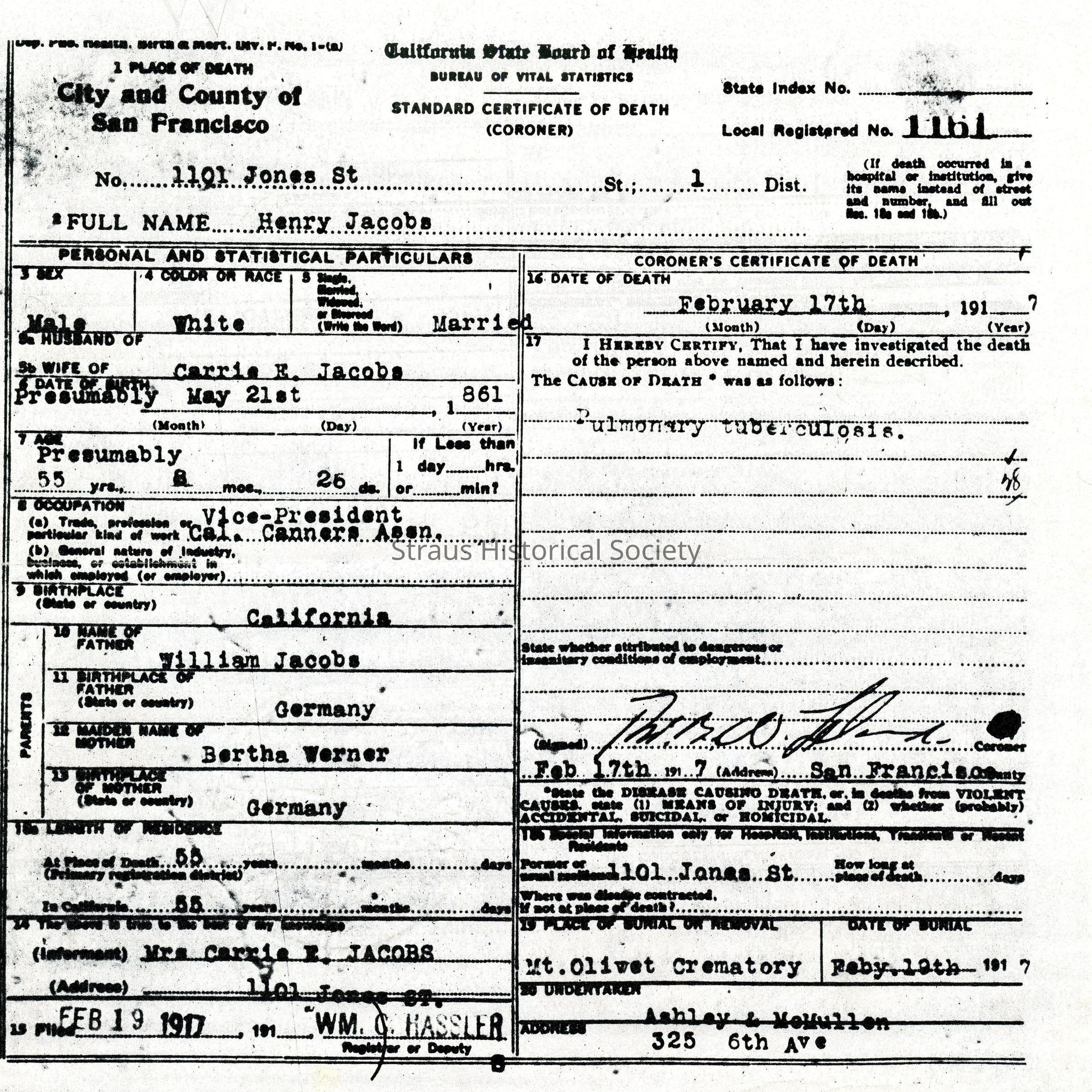 Death Certificate 1161: Henry Jacobs, 1101 Jones Street. 17 February 1917.