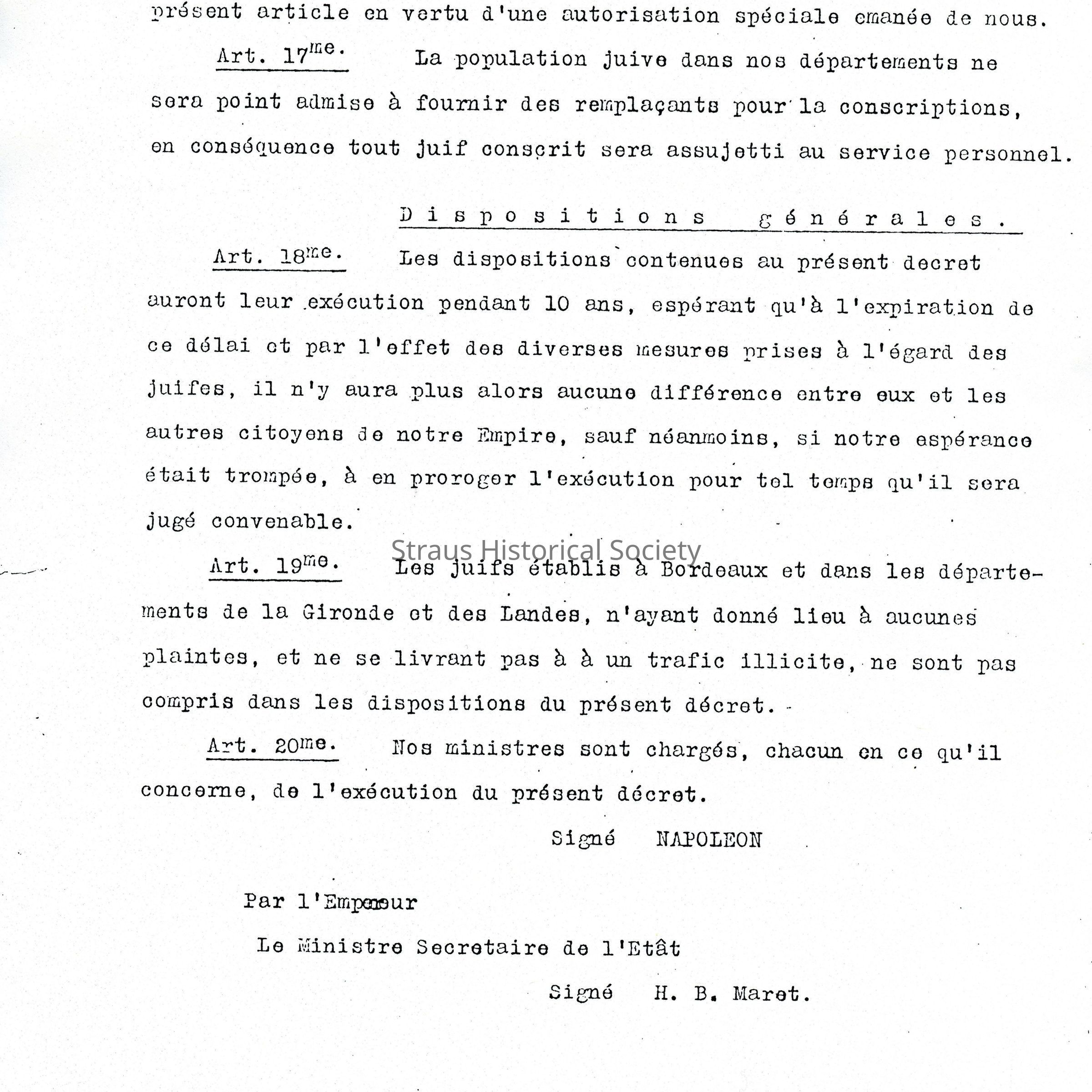 Declaration regulating Jews regarding money both borrowed and lent, the payment of taxes, business requirements, prohibition of Jews from outside the departments of Haut Rhin and Bas Rhin from establishing residence there, all Jews who are drafted must serve. General stipulations are that the decree will be in effect for ten years. Jews of Bordeaux and the departments of Gironde and Landes who have given no reason for complaint are not included in this decree.