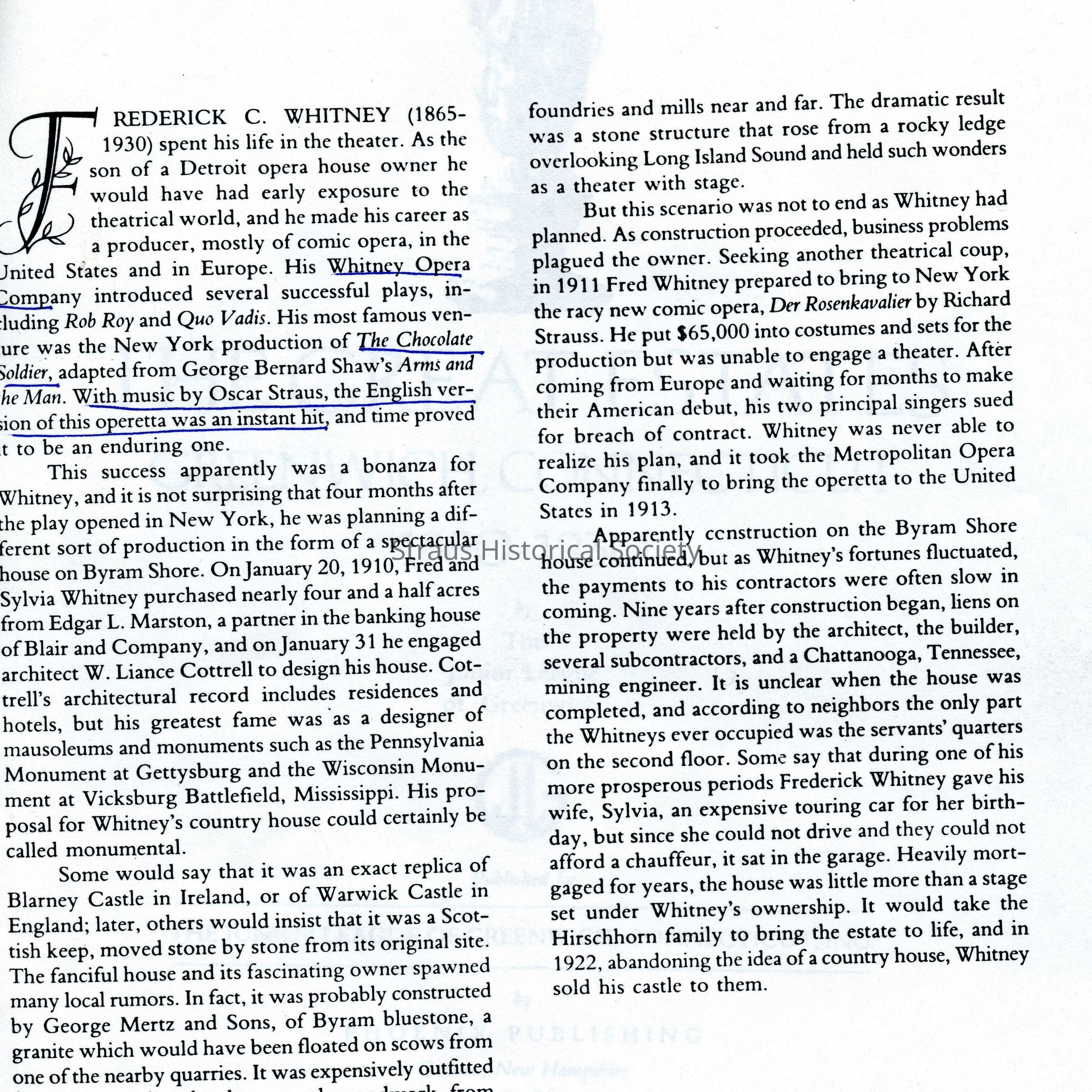 Includes a one page description of Frederick C. Whitney's home with reference to his opera company. "His most famous venture was the New York production of The Chocolate Soldier, adapted from George Bernard Shaw's Arms and the Man. With music by Oscar Straus, the English version of this operetta was an instant hit, and time proved it to be an enduring one."