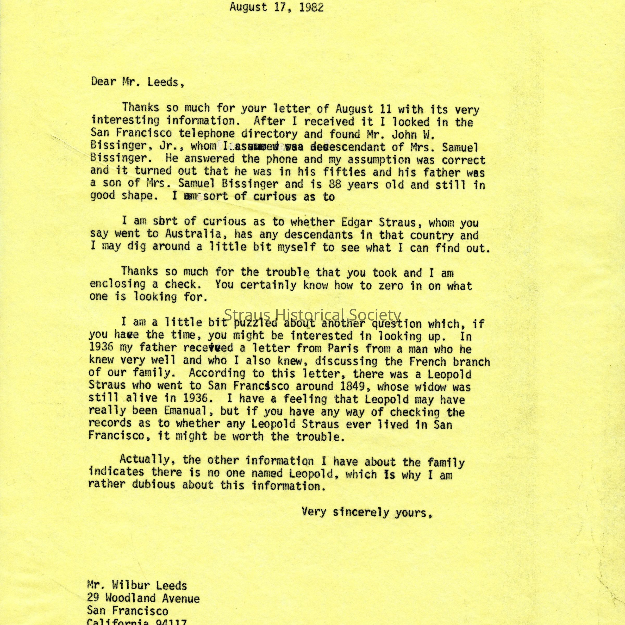 Letter: Straus, Robert Kenneth, Santa Barbara, CA, to Wilbur Leeds, geneologist, San Francisco, CA. 17 August 1982. One typewritten page.