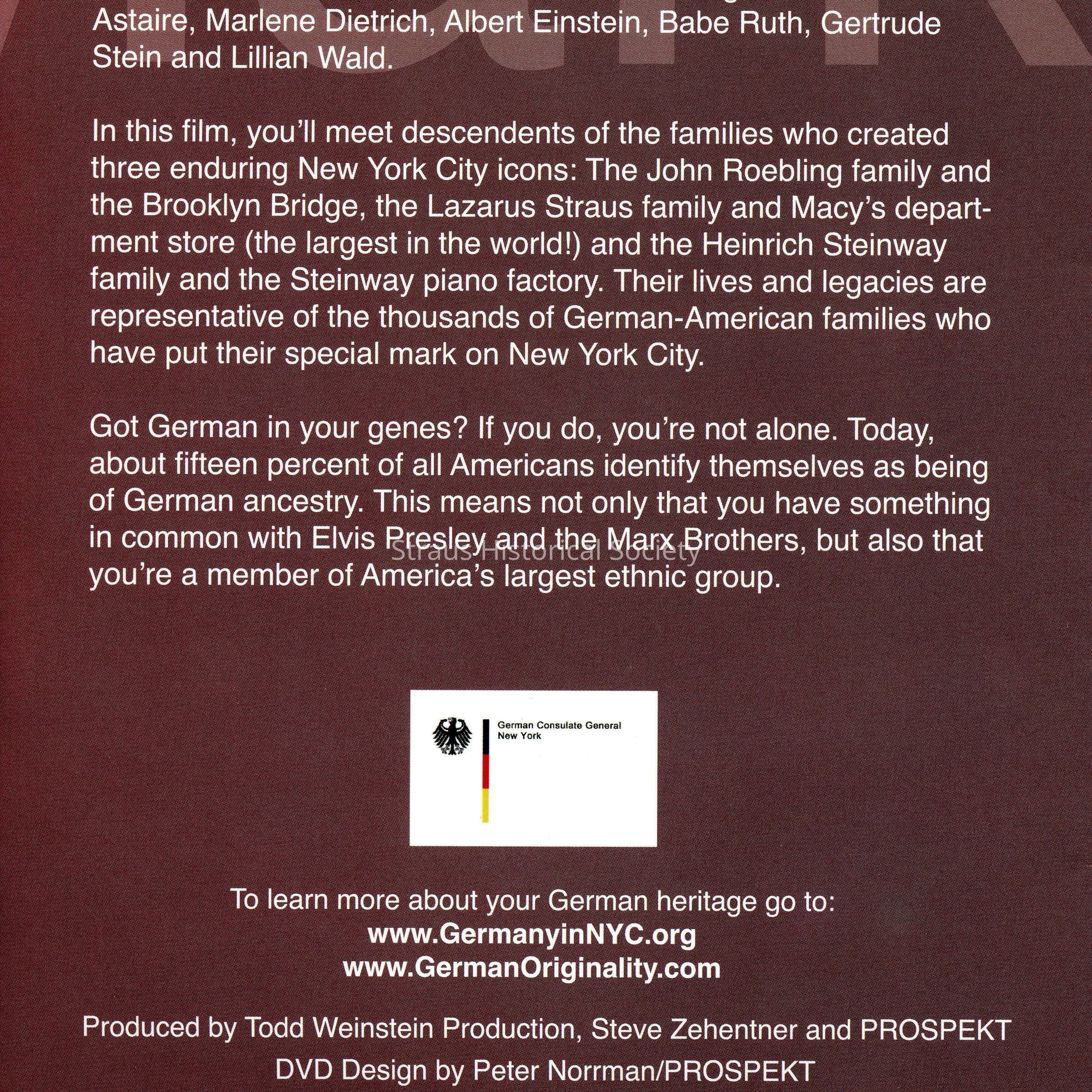 "In this film, you'll meet descendents of the families who created three enduring New York City icons: The John Roebling family and the Brooklyn Bridge, the Lazarus Straus family and the Macy's department store (the largest in the world!) and the Heinrich Stienway family and the Steinway piano factory. Their lives and legacies are representative of the thousands of German-American families who have put their special mark on New York City."