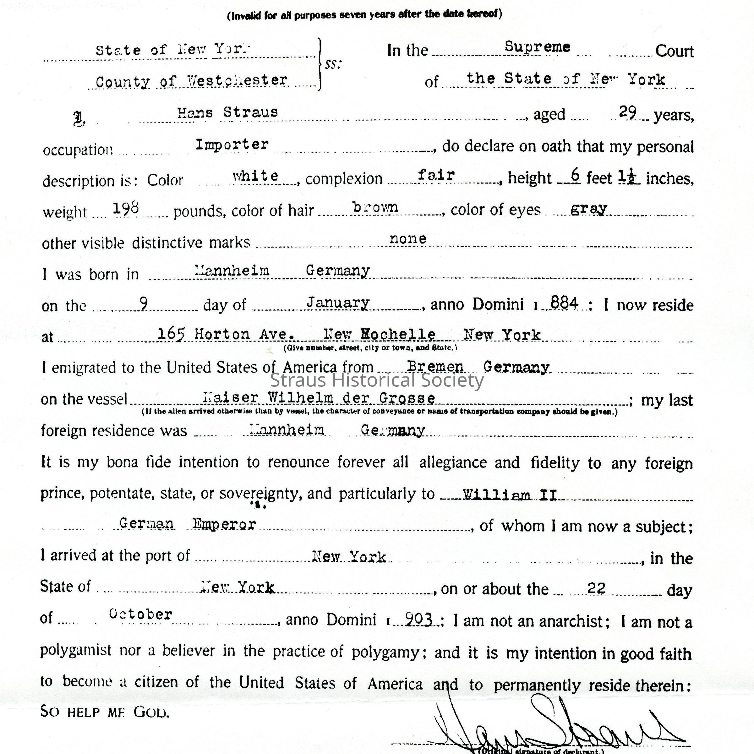 Declaration of Intent: Hans Straus, New York Supreme Court, Westchester County, Number 7193, page 204. 17 June 1913.
