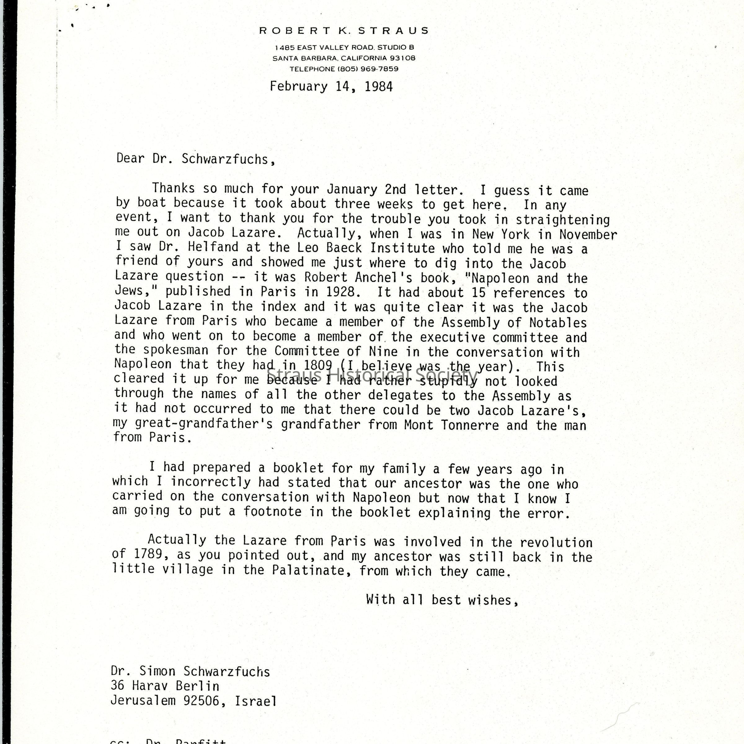 Letter: Straus, Robert Kenneth, Santa Barbara, CA, to Simon Schwartzfuchs, Jerusalem, Israel. 14 February 1984.