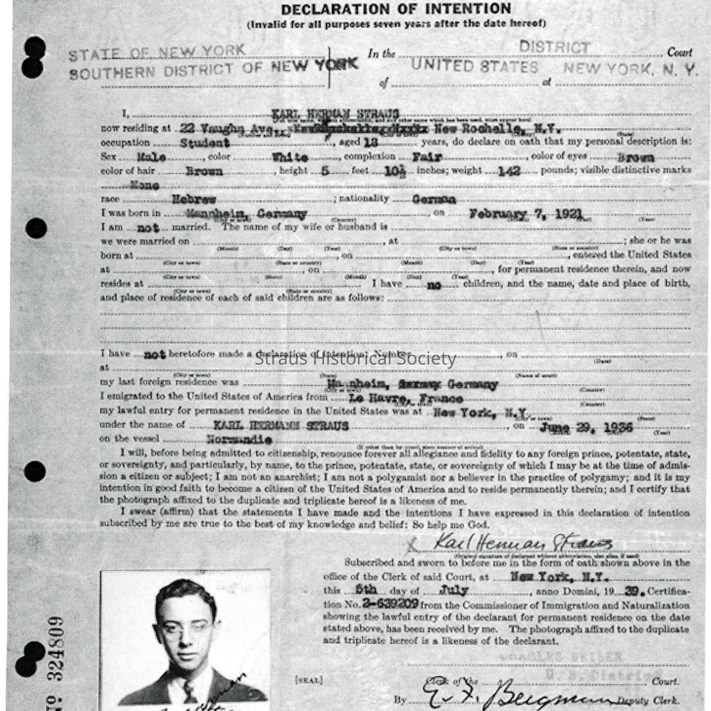 Declaration of Intent: No. 436507. State of New York, Southern District Court; Karl Herman Straus, 5 July 1939.Entry/Object ID