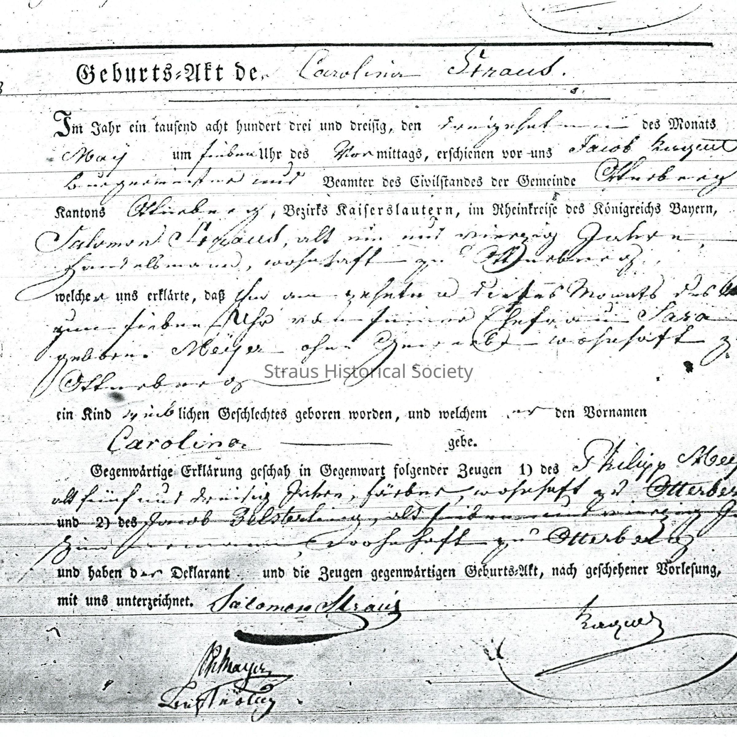 Birth Record # 33: Carolina Straus, daughter of Salomon Straus and his third wife, Sara Mayer. Recorded 13 May 1833 in Otterberg. Printed form with handwritten entries. In Old German.Entry/Object ID