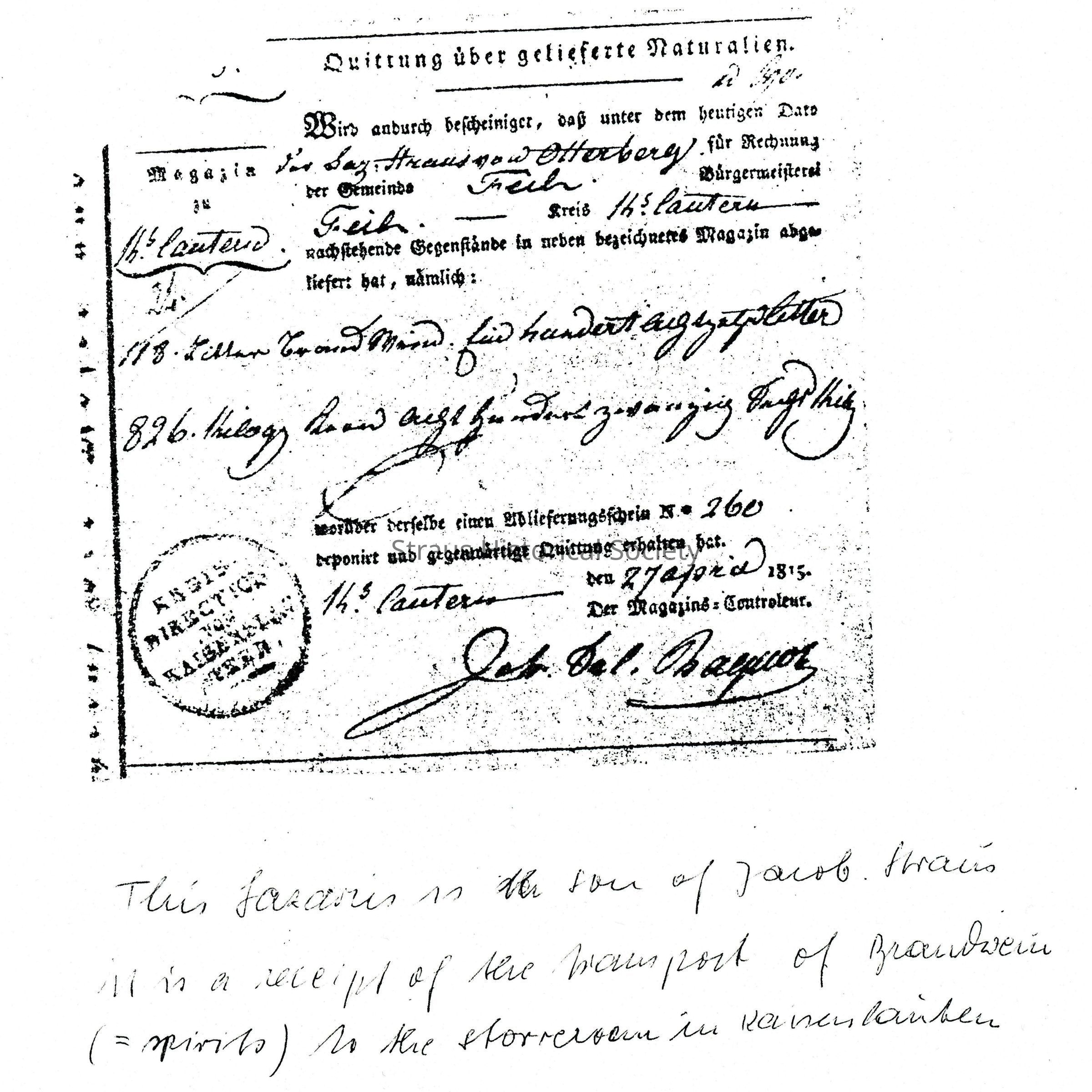 Receipt: Lazarus Straus, son of Jakob Straus, for the transportation of spirits (brandwein) to the storeroom in Kaislerslautern. 27 April 1815.