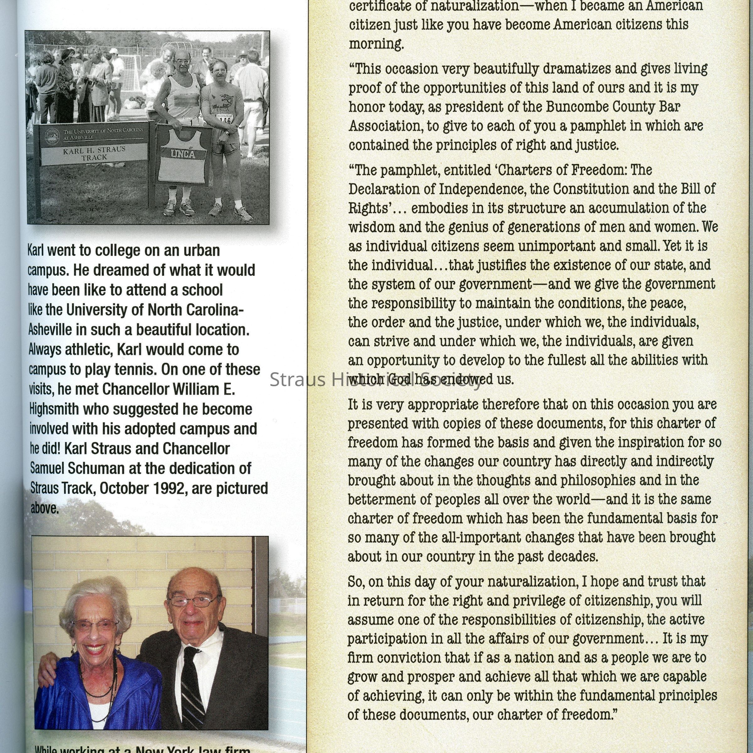 In the section: "Karl Straus: Community Leader Who Fought Intolerance," (pgs. 45-47) the author writes about Karl Straus's immigration of Germany, his family, and his civic contributions to Asheville, N.C., the area he lived in with his family.