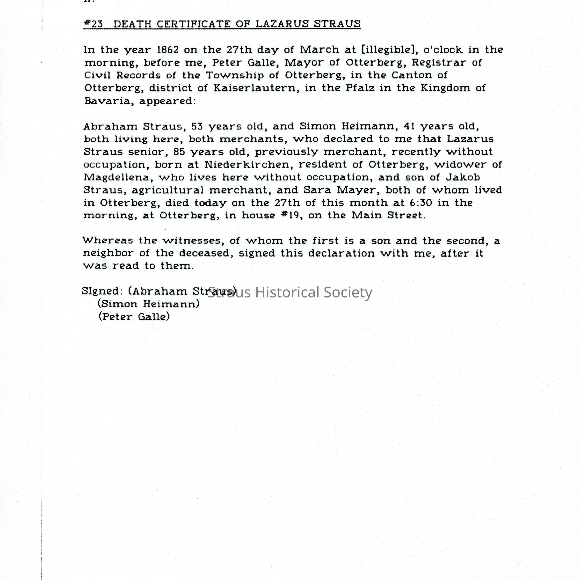 Death Record: Lazarus Straus senior resident of Otterberg died 27 March 1862. One printed form with handwritten entries.