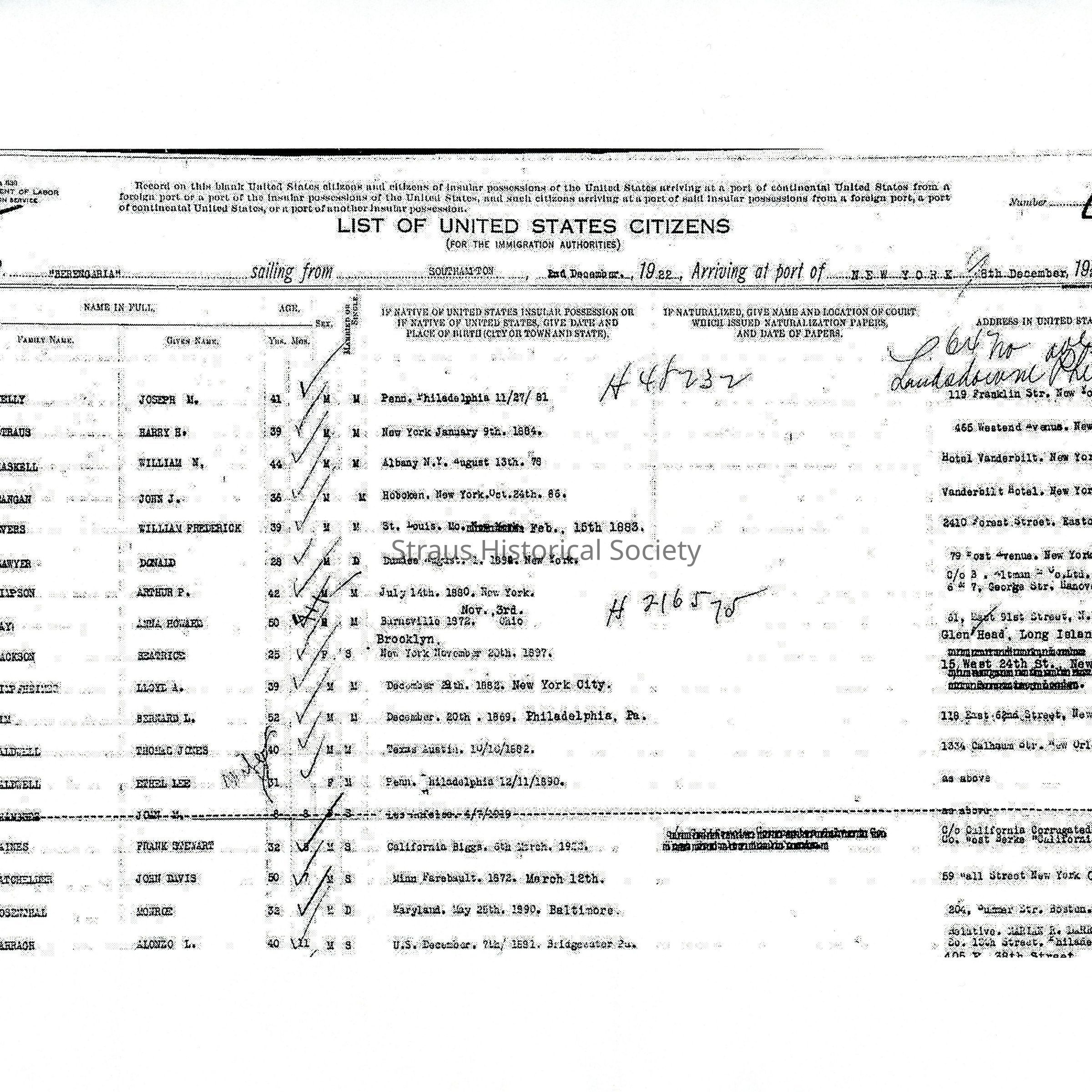 Passenger Manifest: 1922, "SS Berengaria," Harry H. Straus.Entry/Object ID