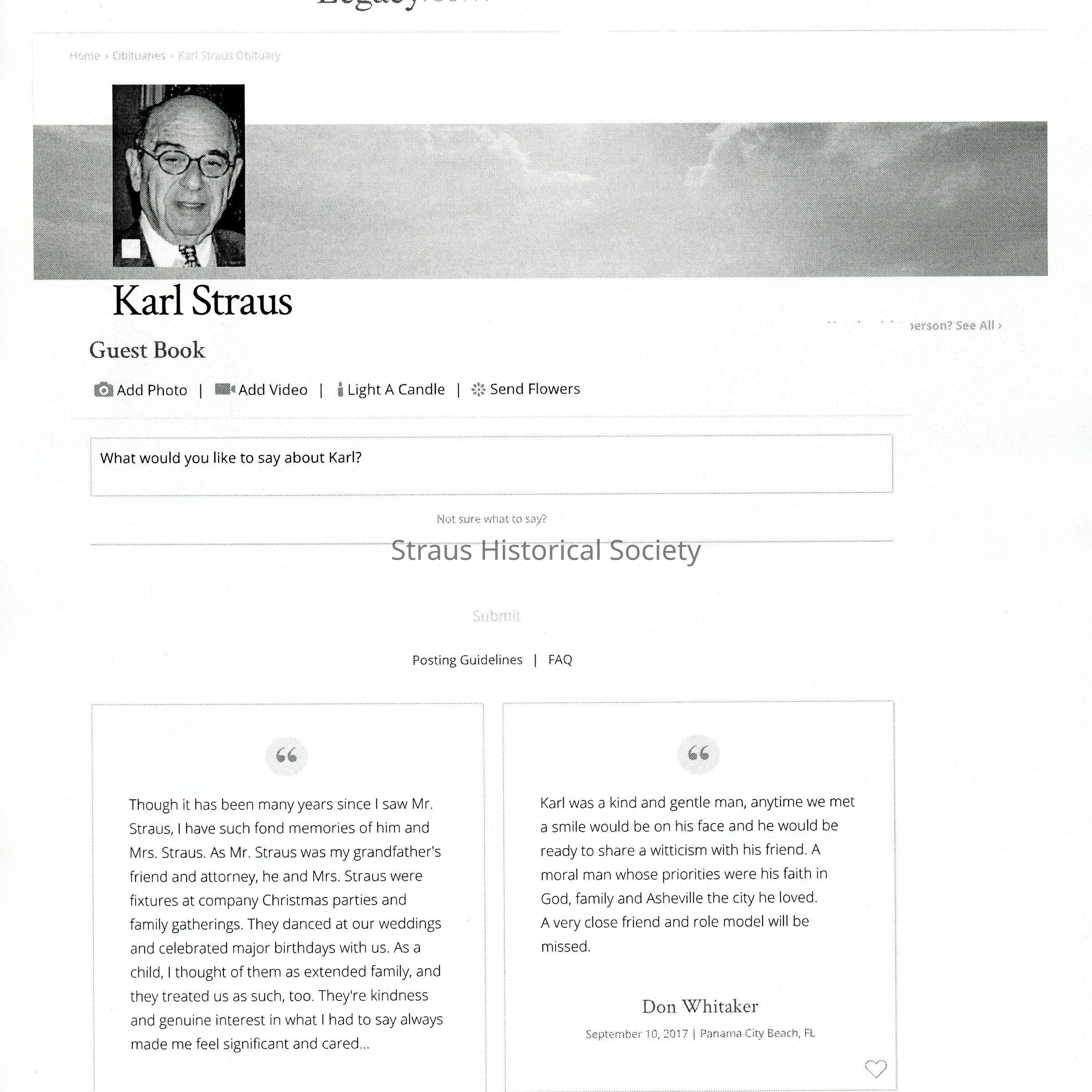 Obituary: "Karl Straus: Guest Book," Legacy.com Asheville, NC. 11 September 2017. Three pages with photograph.