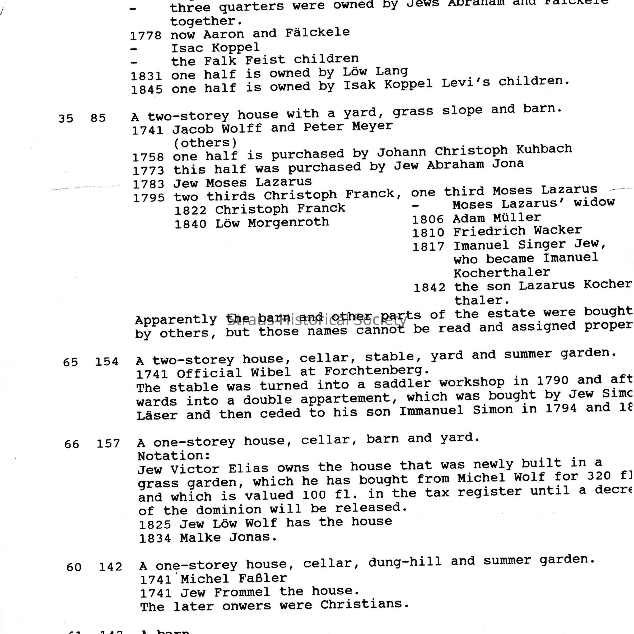 Land and tax register of the district of Ernsbach, 1741-1848. People named are: Jona Jew, Jew Wolf Herz Abraham, Jew Abraham Jonas, Jew Immanuel Abraham, Abraham unmarried, Simon Oppenheimer, Laiser Jew, Jew Schimmel, Jew Izig, Läzer Simon Rosenthal, Anschel Isaac, Abraham Lazarus Rosenthaler, Izig Jew, Moses Hirsch, Samuel Koppel, Mose Rosenthal, Kilian Wolf, Jew Isaac, Jew Mam, Jew Isaac Marum, son Marum Isaac Strauss, Michael Keydel, Schmlen Jew, Aaron and Fälckele, Fak Feist, Löw Lang, Isak Koppel Levi's children, Jacob Wolff, Peter Meyer, Jew Abraham Jona, Johann Christoph Kuhbach, Jew Moses Lazarus, Christoph Franck, Löw Morgenroth, one third Moses Lazarus's widow, Friedrich Wacker, Adam Müller, Imanuel Singer Jew who became Imanuel Kocherthaler, the son of Lazarus Kocherthaler, Jew Simon Läser, son Immanuel Siomn, Jew Victor Elias, Michel Wolf, Jew Löw Wolf, Malke Jonas, Michel Fassler, Jew Frommel, Michel Renck, Chrisoph Weinman,