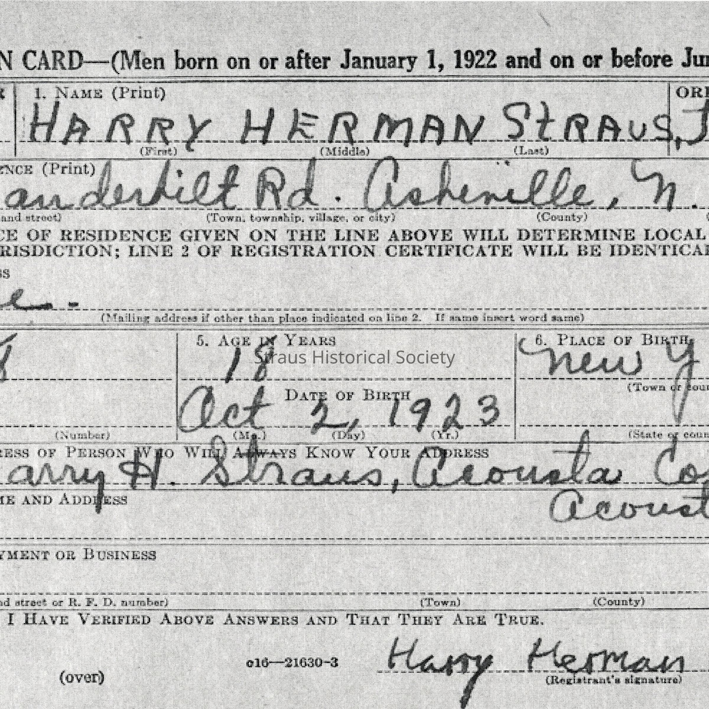 World War II Draft Registration: 1941 Registration No. 12325, Harry H. Straus Jr. Age 18, Born New York City October 2, 1923. Residence Asheville, N.C. One page.