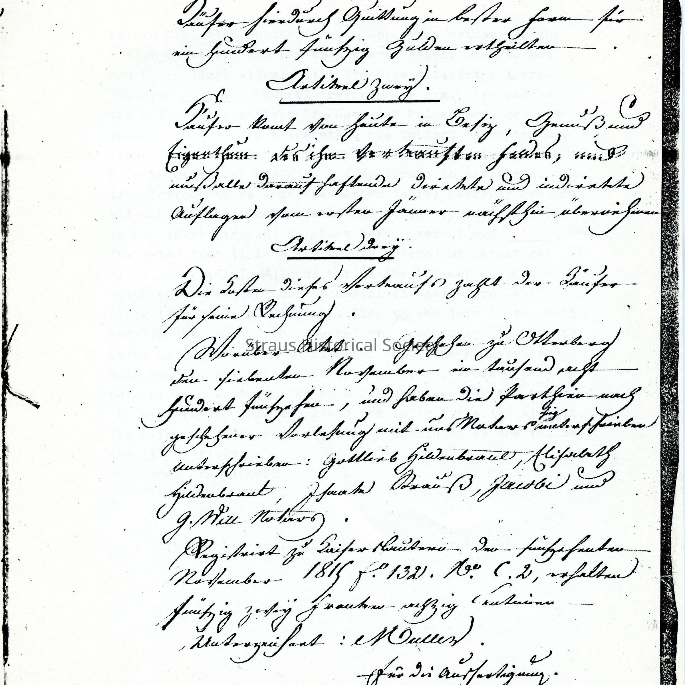 Business Paper: Gottlieb Hildebrand and his wife Elisabetha nee Hubing sold to Isaak Strauss 47 Aren (1 Ar. = 100 square meters). A description of the land is included on these pages. 15 November 1819. In Old German. Four handwritten pages. With English translation by Gertrud Miller.
