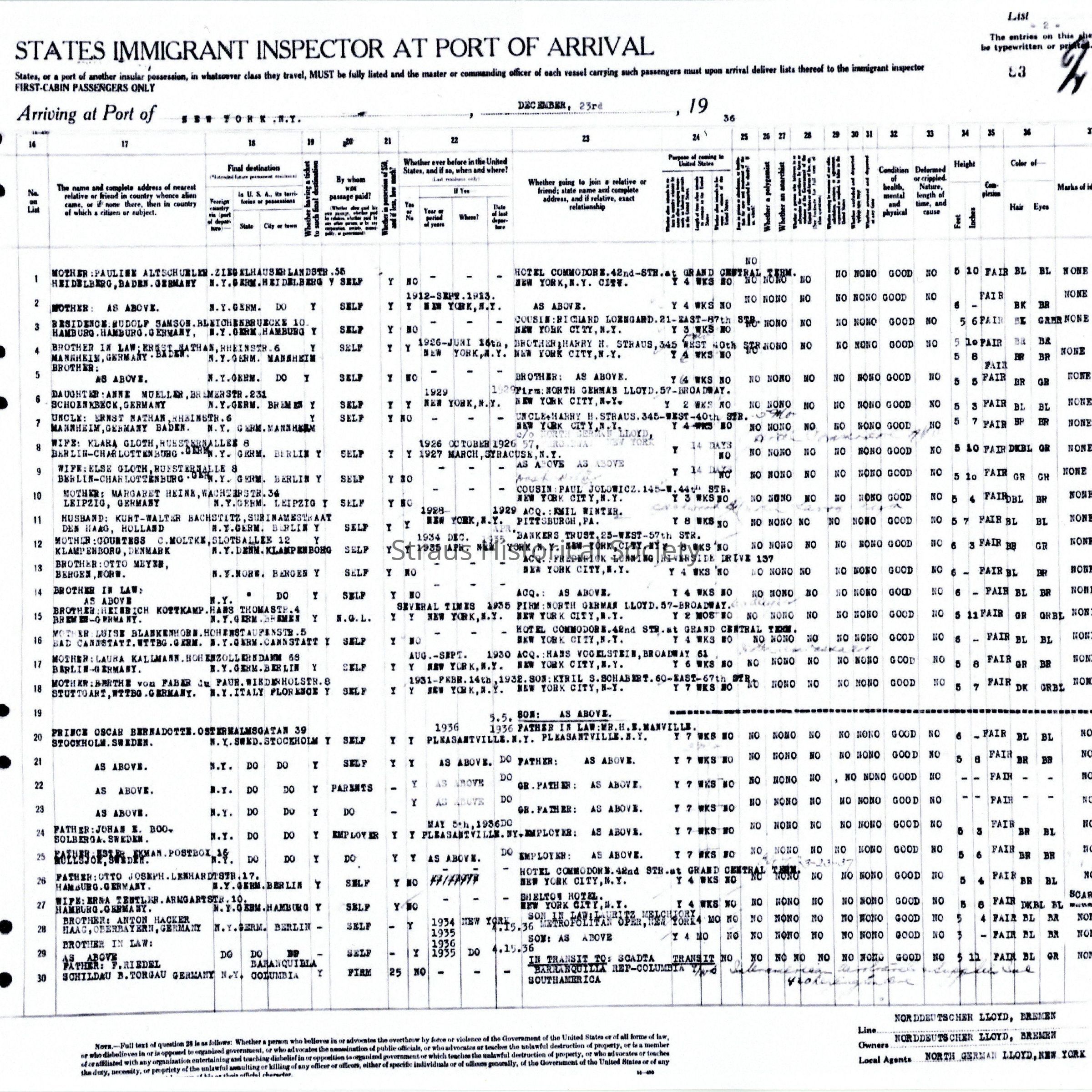 Passenger Manifest: "SS Europa," From Breman December 16, 1936 to New York, arriving December 23, 1936: Ludwig Straus, age 55, Merchant, Born Mannheim Germany, Visa:Stuttgart PV S3/2, 401 Stuttgart 10-30-1926, Elisabeth Straus, age 53, wife, Born Stuttgart, Germany, Visa Issued in Stuttgart PV S3/2 402 Stuttgart 10-30-1936, Dorothea Straus, age 17, daughter, Born Mannheim, Germany, Visa PV S3/2 493 Stuttgart 10-30-1936. Last permanent address for all Mannheim. Going from Brother-in-law, Ernst Nathan, Rhienstr. 6, Mannheim, Passage paid by self, last in US, 16 June 1926, Going to brother