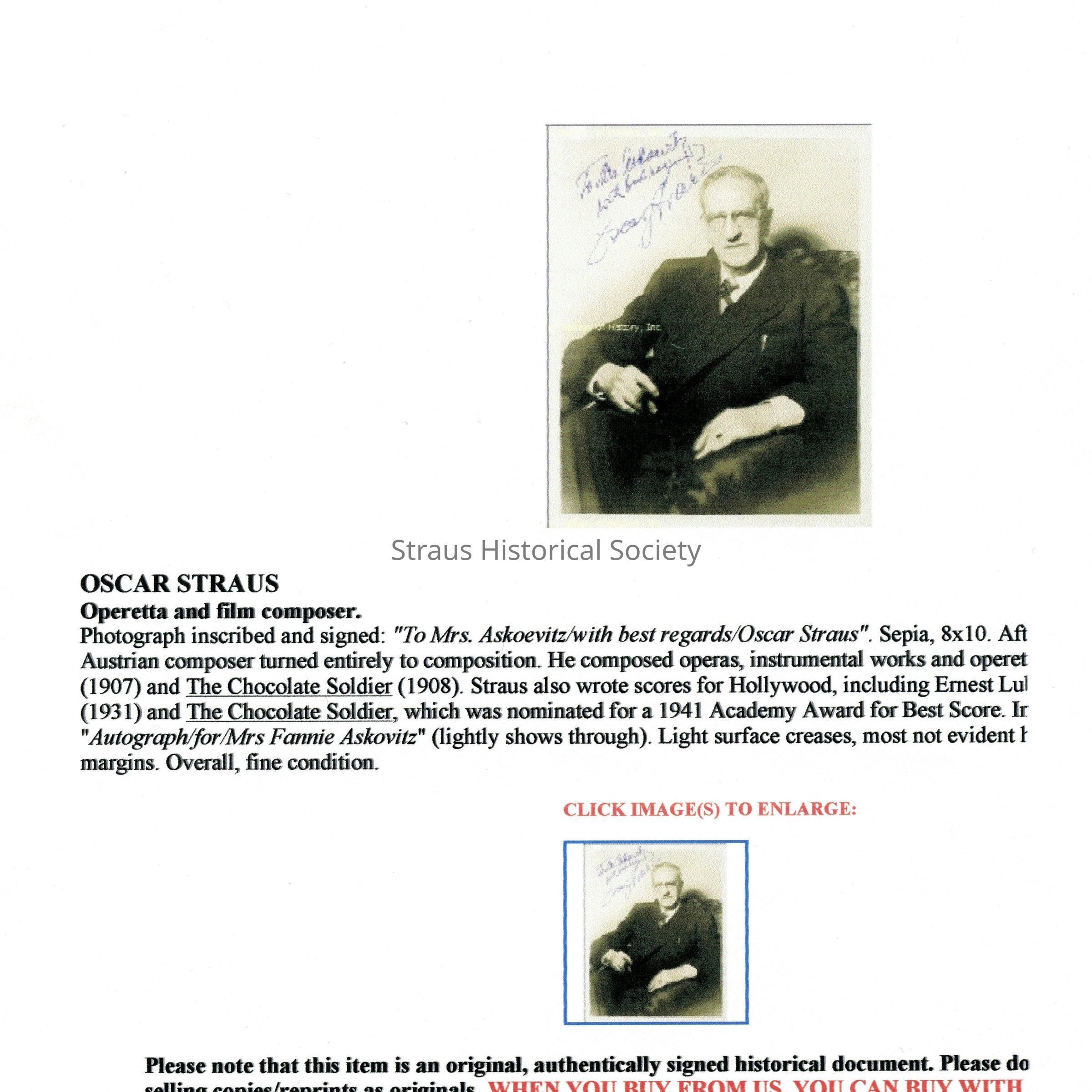 Oscar Straus was the great grandson of Ester Fradche, sister of Lazarus Straus. Photo inscription: "To Mrs. Askoevtiz/with best regards/Oscar Straus." Photographer unlisted.