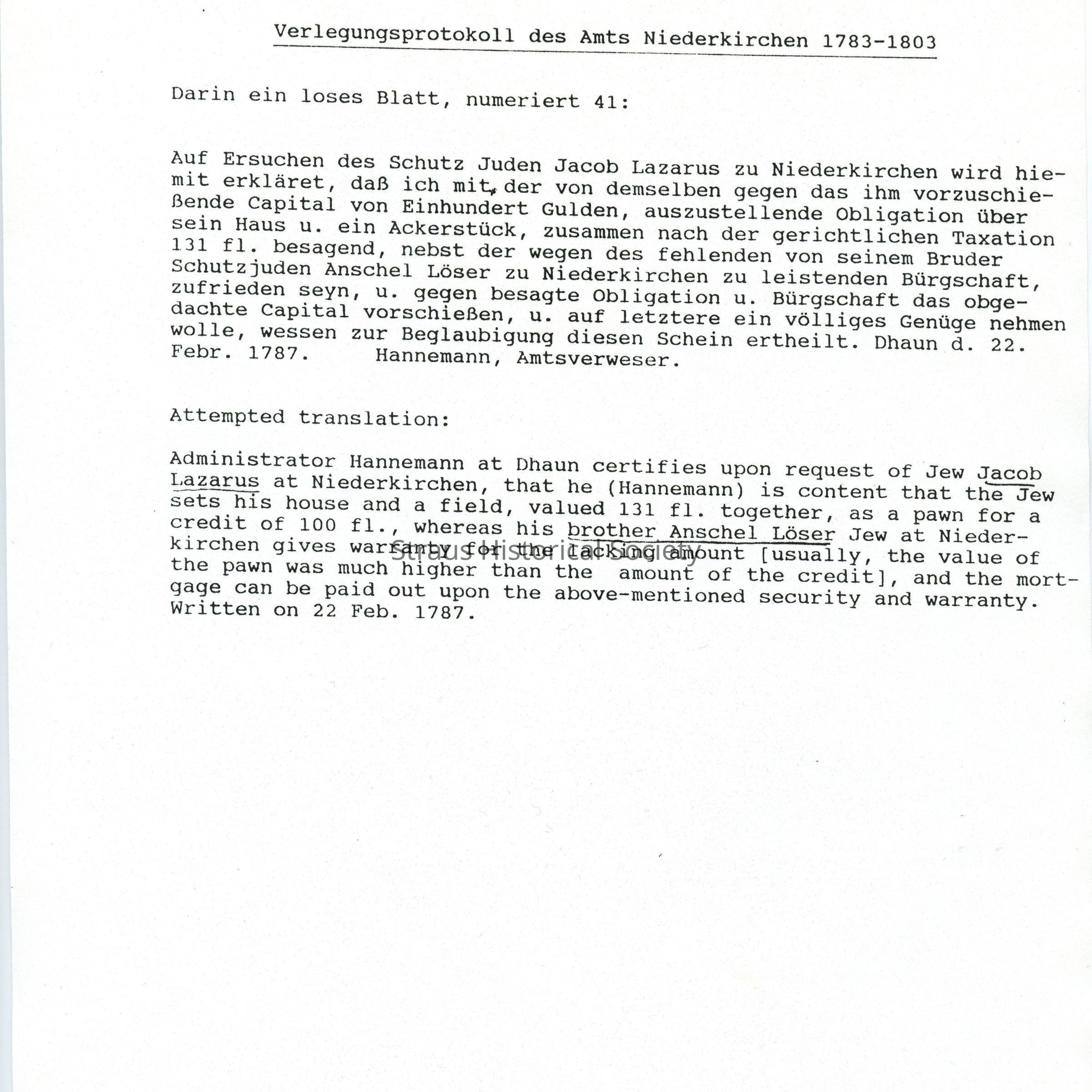 "Darin ein loses Blatt, numeriet 41." (Jacob Straus)