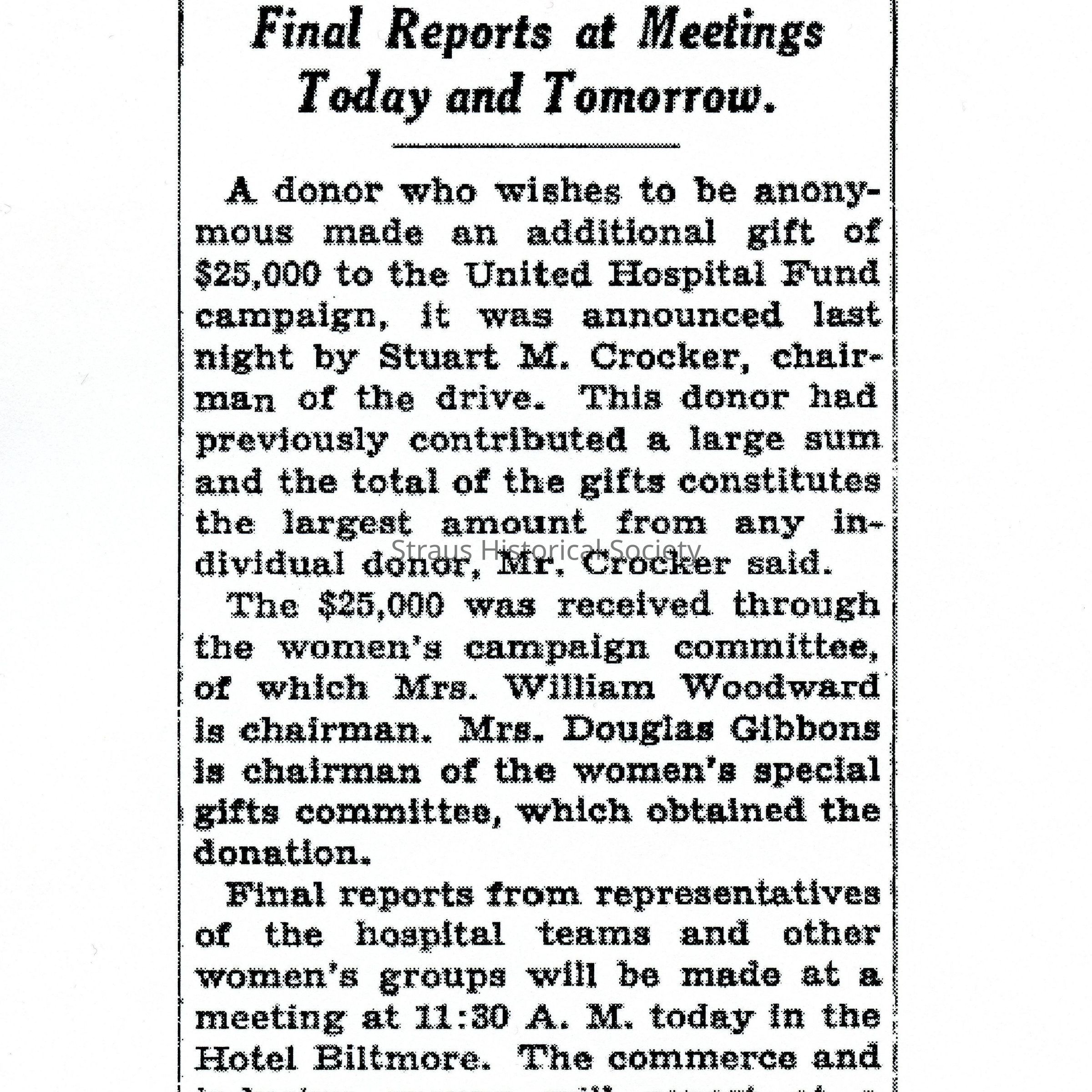 Article: "$25,000 Gift Added to Hospitals Fund," The New York Times.