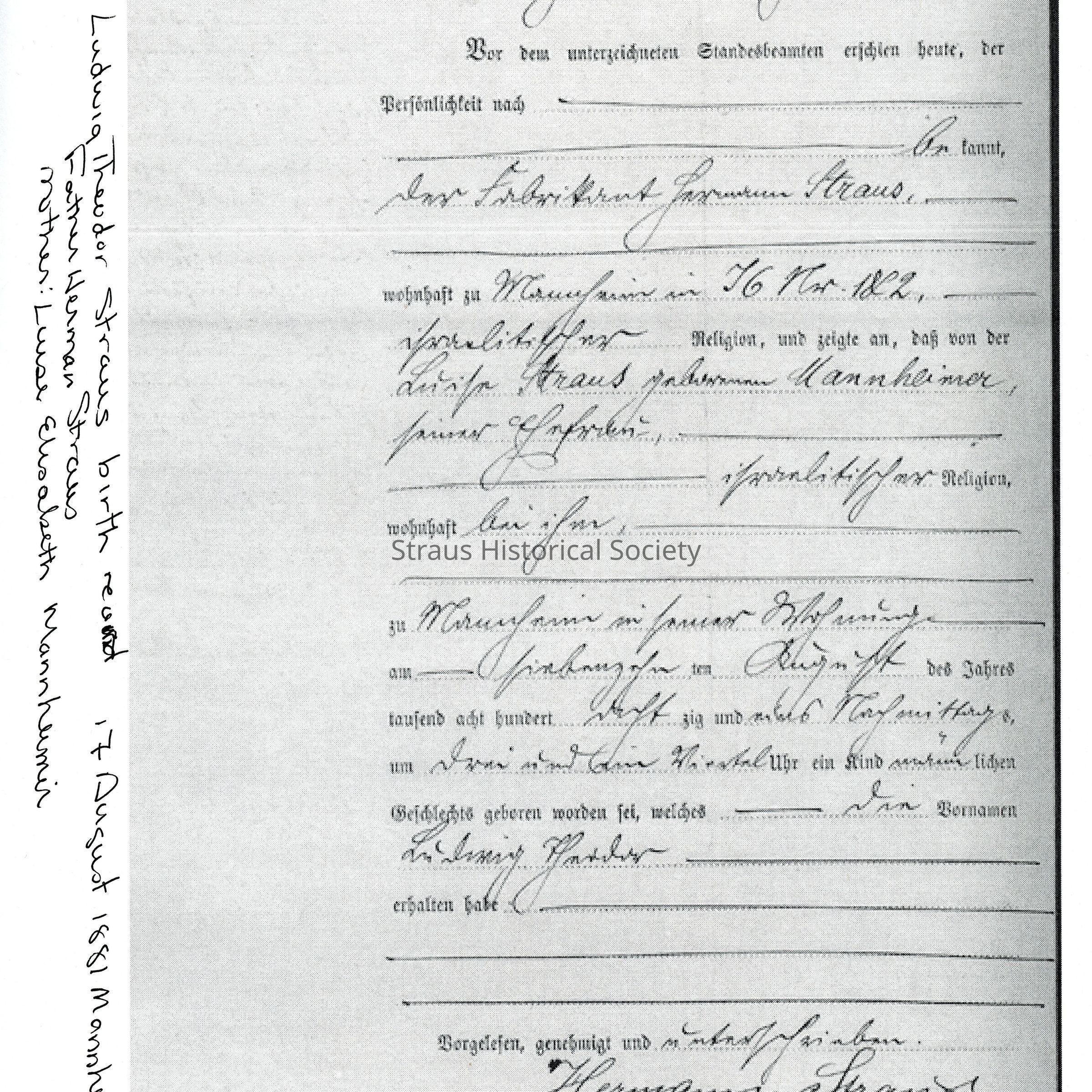 Birth Record: Ludwig Theodor Straus, born Aug. 17, 1881 in Mannheim, Baden, Germany. Father: Hermann Straus. Mother: Luise Elisabeth Mannheimer.
