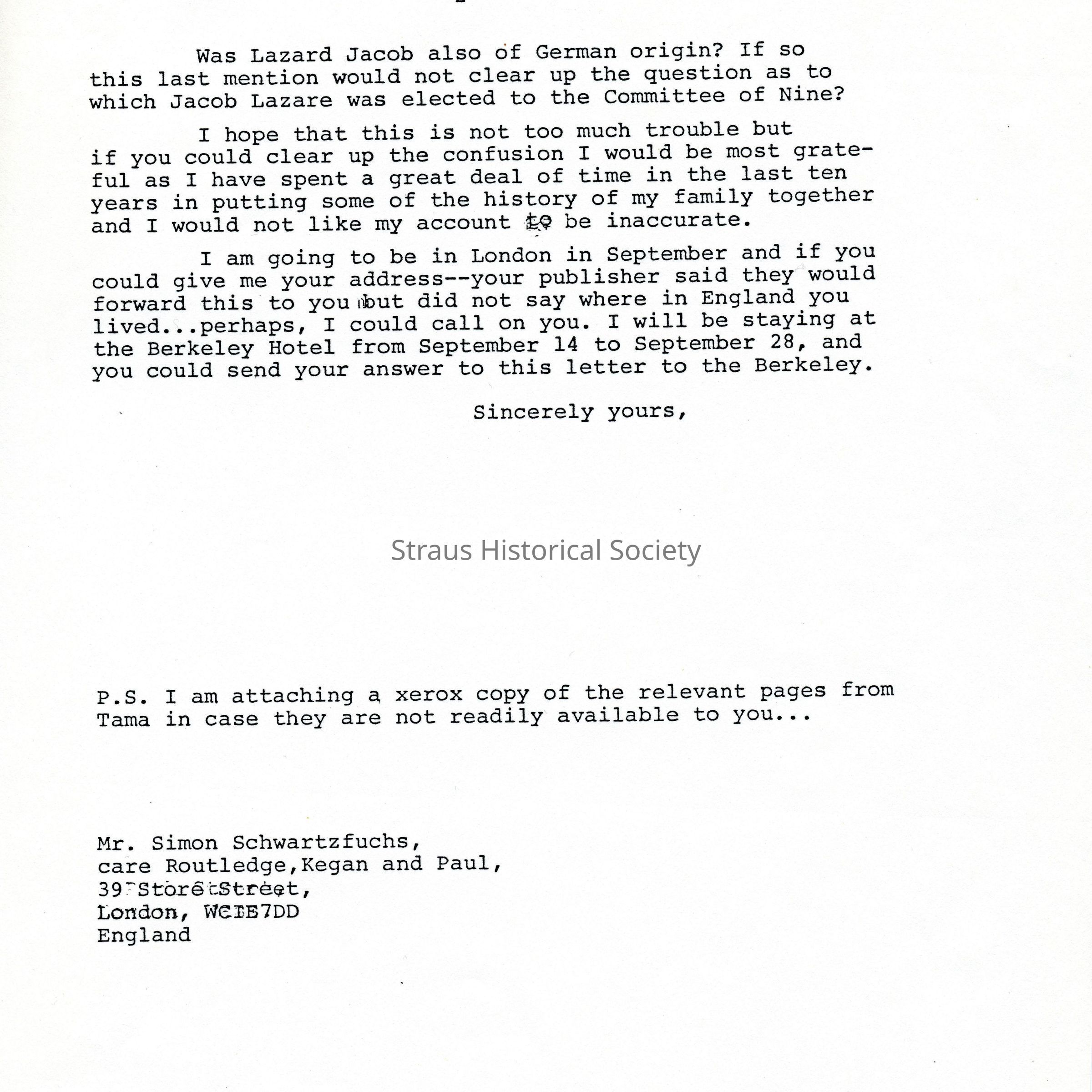 In this letter, R.K. Straus requests aid in finding information about his ancestor, Jacob Lazare, father of Lazarus Straus.