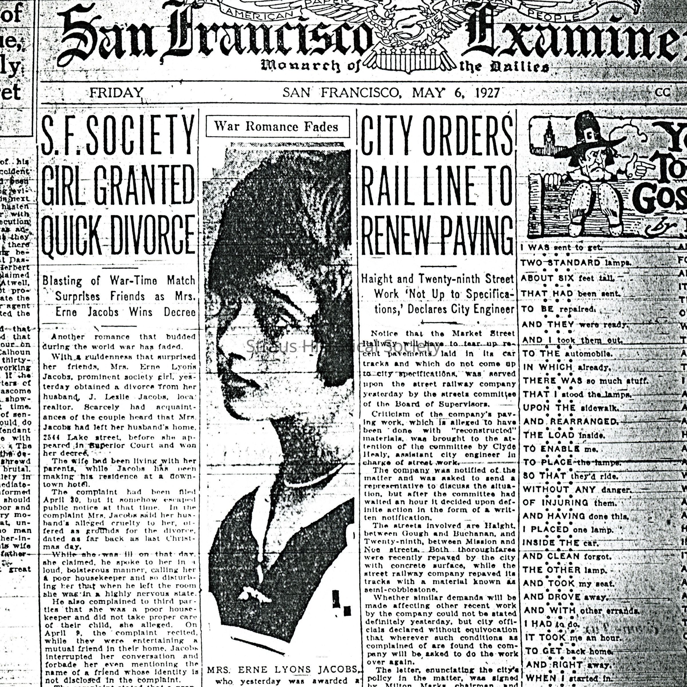 Article: "S.F. Society Girl Granted Quick Divorce: Blasting War-Time March Surprises Friends as Mrs. Erne Jacobs Wins Divorce," San Francisco Examiner, San Francisco. 6 May 1927.Entry/Object ID