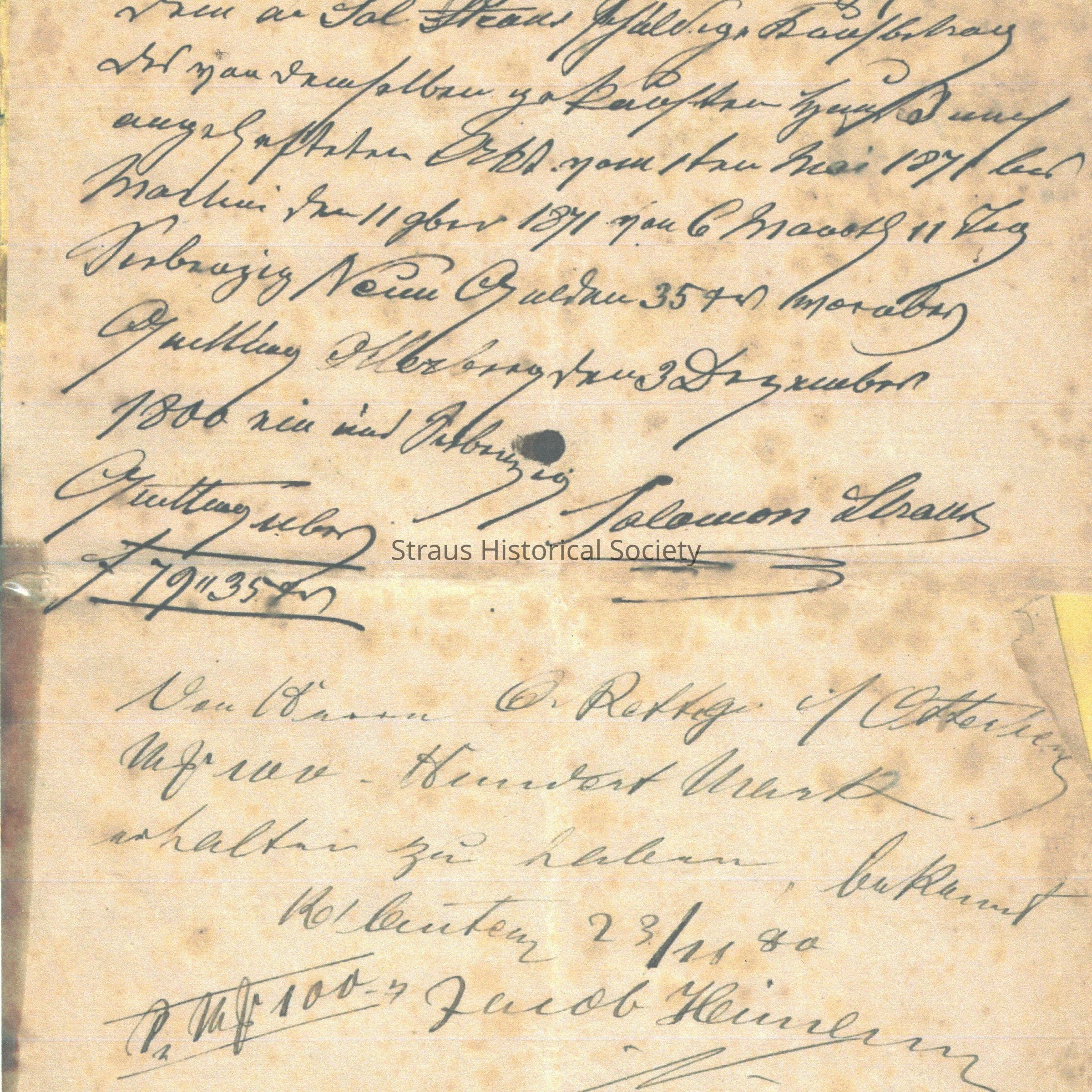 Sales Contract between Conrad Rettig, baker and brick maker, residing in Otterberg, and his wife Katherina GÖdel and Salomon Strauss [sic], merchant, and his wife Sara Mayer, for Plots 81, 82, 83 and 84, three decimal residential buildings with barn and stable, a two decimal yard, a one decimal residential building with barn and stable and a six decimal garden situated on Grossgasse in the municipality of Otterberg and bordering at the lower side of the property of Georg Becker the second, on the upper side to the property of Franz Massa and the adjacent garden, at the rear side to the municipal alley. Plot number 396, one decimal garden in the municipality of Otterberg adjacent to the property of Salomon Strauss [sic] and the street. (Note: One decimal is 366 square feet.) The price was 3,000 guilders payable in three equal installments. The contract is dated 16 April 1874. In German