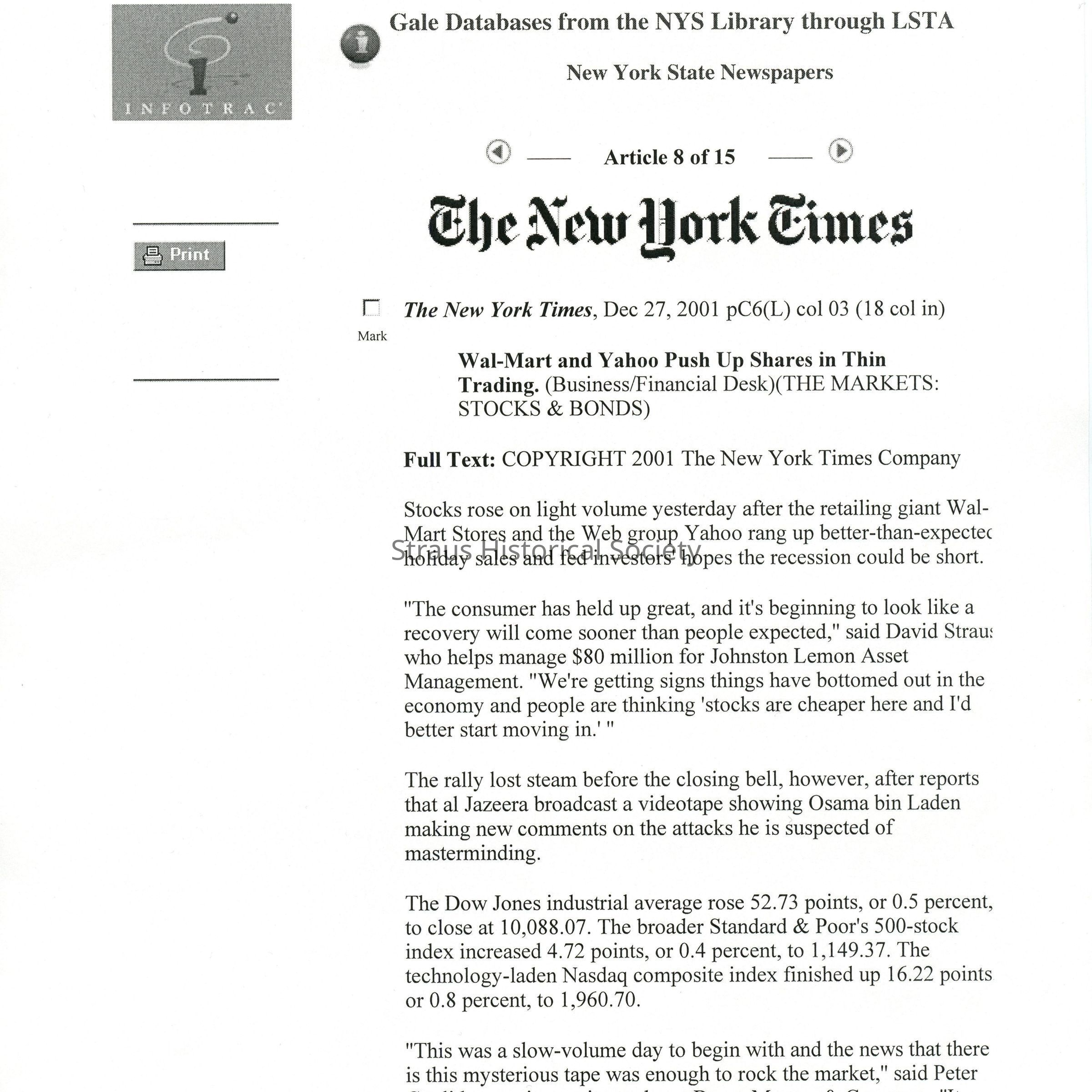 Article: "Wal-Mart and Yahoo Push Up Shares in Thin Trading," The New York Times. 27 December 2001.Entry/Object ID