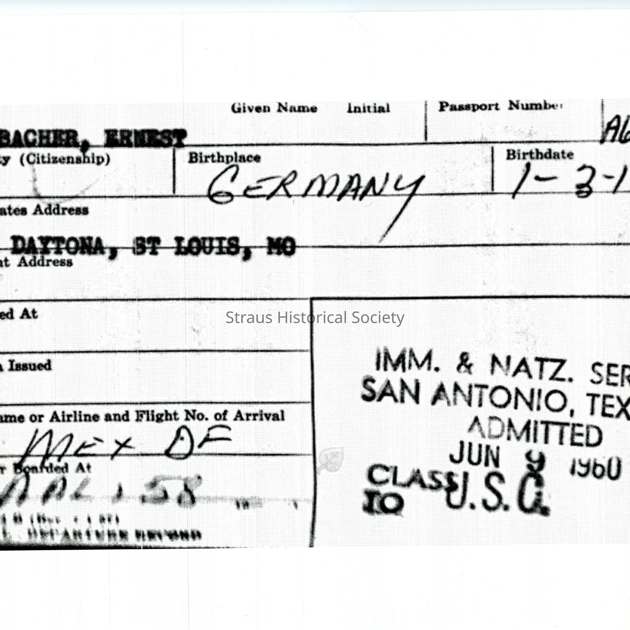 Passsenger List: Texas Passenger List for Ernest Auerbacher, admitted 9 June 1960, San Antonio, TX. One page.